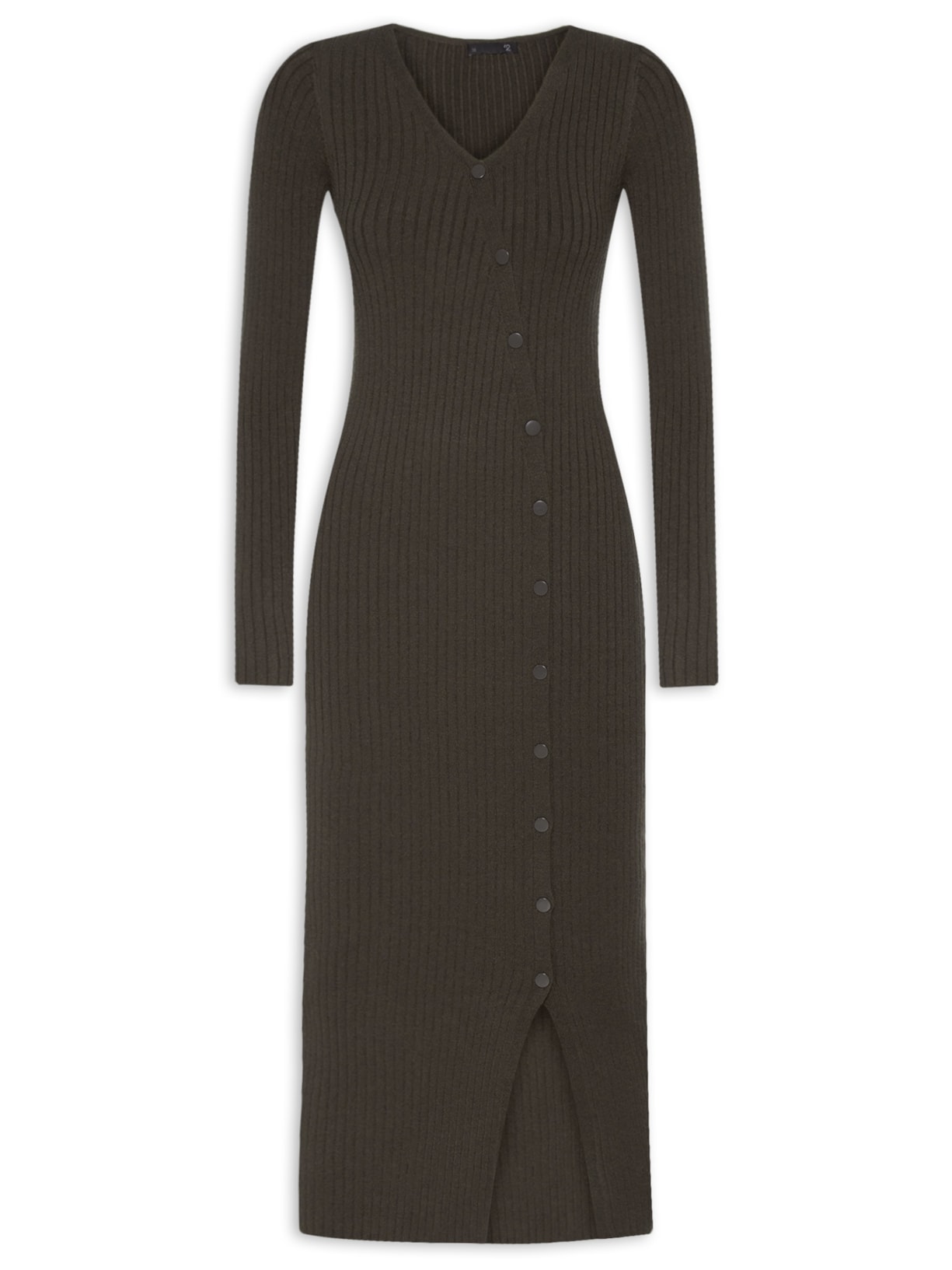 O vestido marrom é confeccionado em tricot com superfície canelada sem elasticidade. A peça justa ao corpo possui decote V, mangas longas, comprimento midi e fechamento frontal por botões.