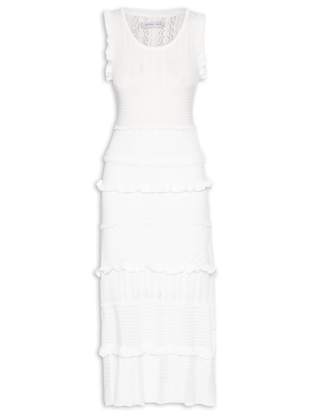 O vestido off white é confeccionado em tricot com alta elasticidade. A peça justa ao corpo possui decote em U, alças médias, cavas regulares, recortes com tramas com acabamentos variados, recortes de tiras finas com efeito franzido, meio forro, leve transparência e comprimento midi.