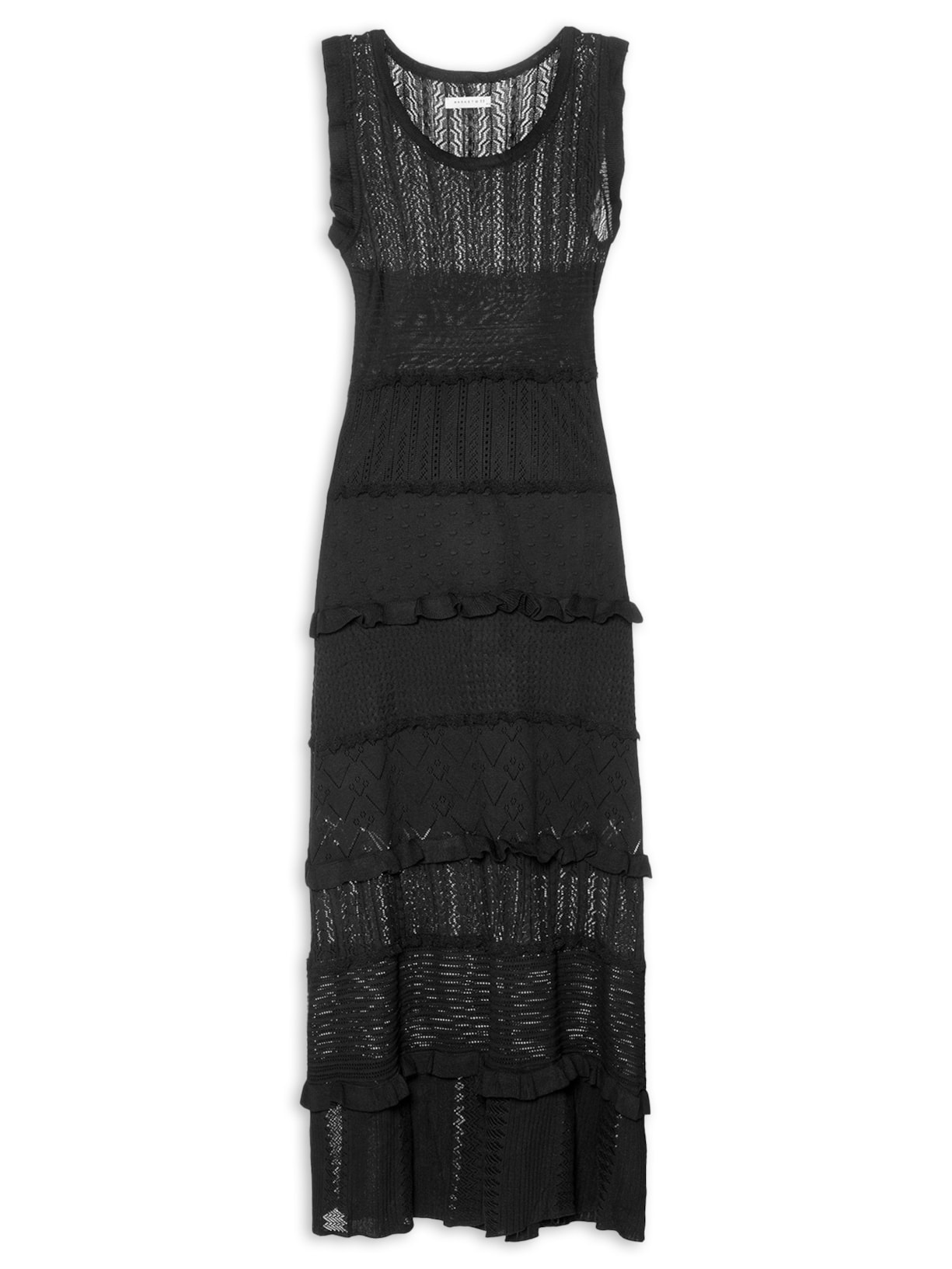 O vestido preto é confeccionado em tricot com alta elasticidade. A peça justa ao corpo possui decote em U, alças médias, cavas regulares, recortes com tramas com acabamentos variados, recortes de tiras finas com efeito franzido, meio forro, leve transparência e comprimento midi.
