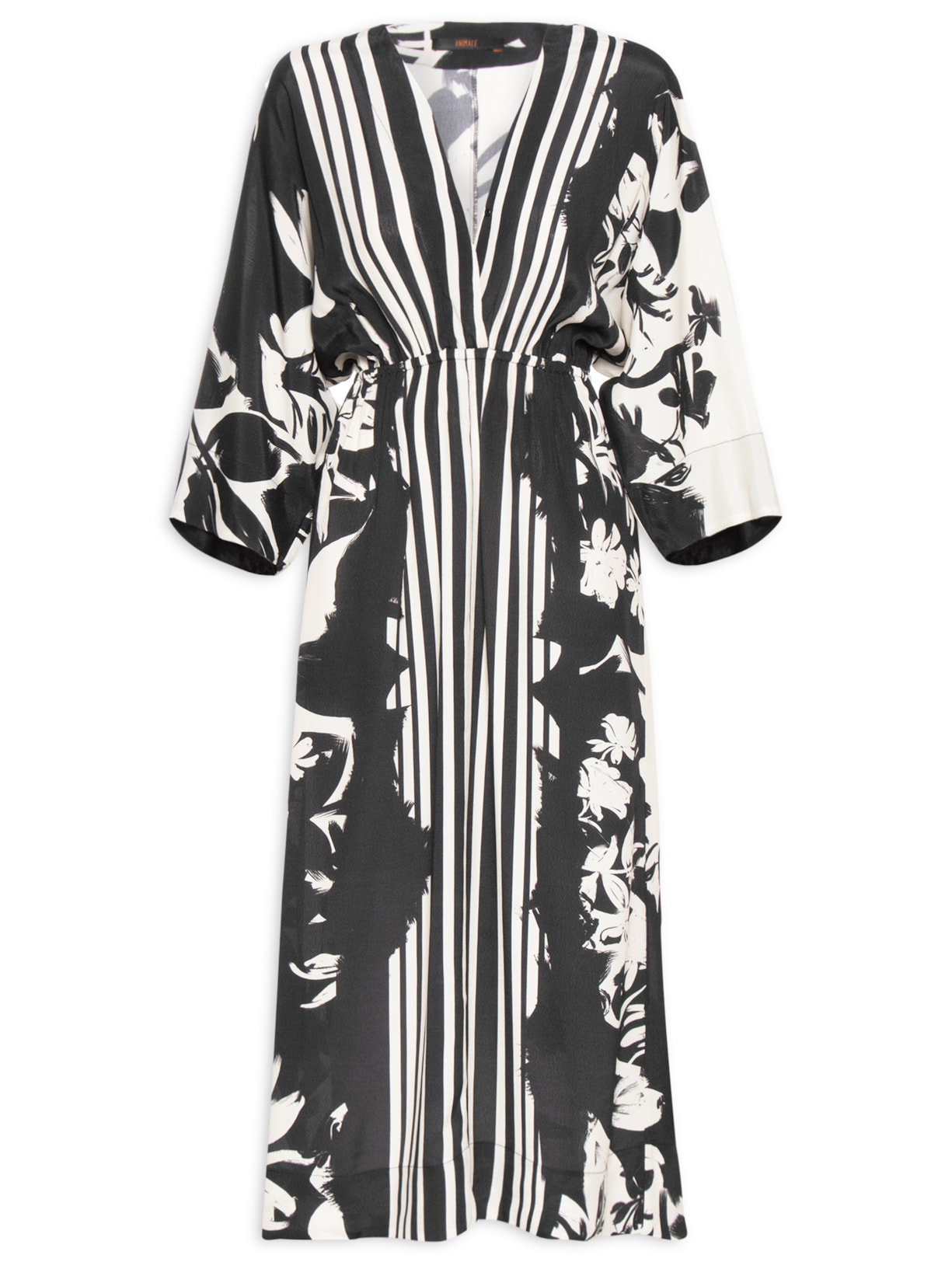 O vestido preto é confeccionado em tecido leve sem elasticidade. A peça solta ao corpo possui decote V transpassado, mangas japonesas 7/8, elástico embutido na cintura, transparência, mix de estampas em cor contrastante, fenda posterior e comprimento midi.