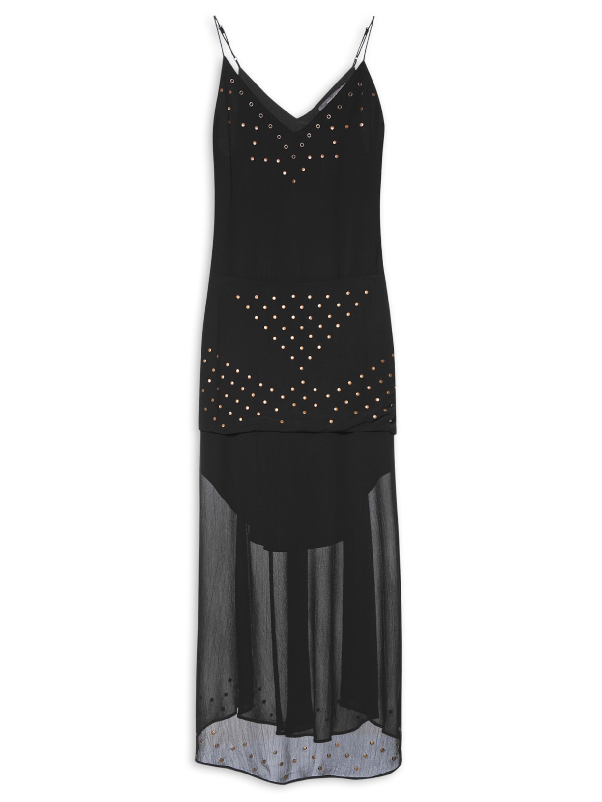 O vestido preto é confeccionado em tecido leve sem elasticidade. A peça solta ao corpo possui decote V, alças finas, cavas levemente estendidas, aplicações na altura do busto e barra por ilhos e tachas, faixa na cintura com aplicações de tachas e ilhos com lastex posterior embutido, forro e comprimento midi.