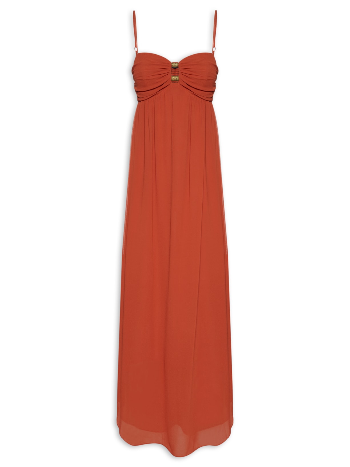 O vestido vermelho é confeccionado em crepe sem elasticidade. A peça justa ao busto e solta no comprimento possui decote coração, alças finas reguláveis, recorte frontal vazado com aplicação de anéis metálicos, efeito drapeado no busto, lastex aplicado na parte posterior, pences posteriores, barra arredondada, leve transparência, forro, sem bojo e comprimento midi.