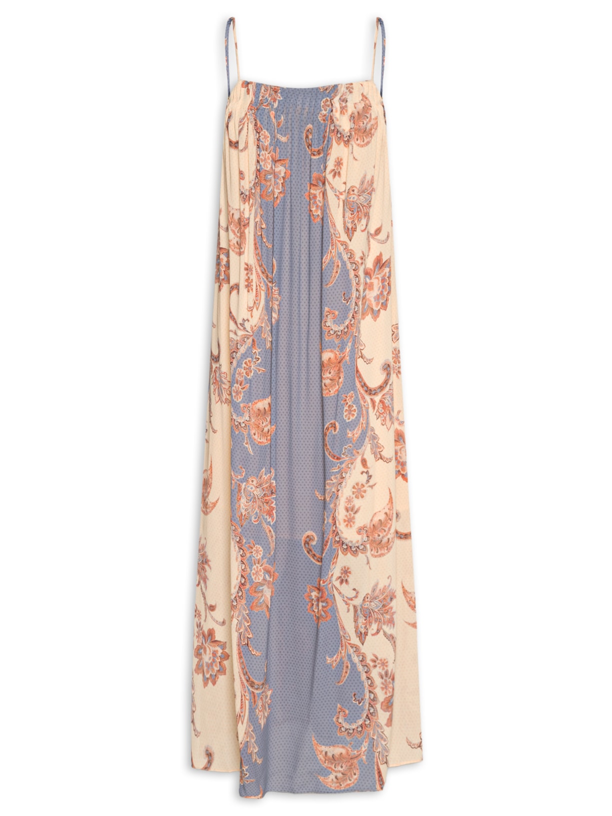 O vestido bege é confeccionado em crepe sem elasticidade. A peça solta ao corpo possui decote quadrado, alças finas com regulagem, elástico embutido na parte posterior e pregas na parte frontal na altura do decote, meio forro, fendas laterais, mix de estampas em cores contrastantes e comprimento midi.