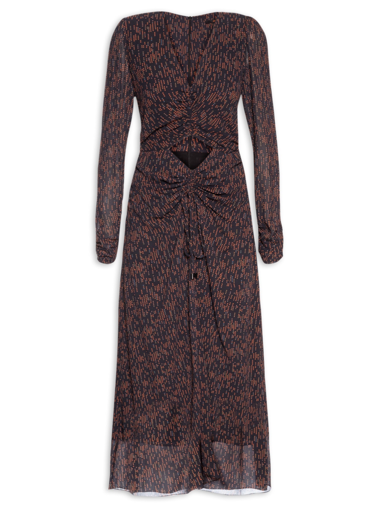 O vestido preto é confeccionado em tecido leve sem elasticidade. A peça justa ao busto e solta no comprimento possui decote V, mangas longas franzida nos punhos, recorte frontal vazado com franzido e tira alongada embutida para amarração, estampa poá em cores contrastantes, leve transparência, forro, comprimento midi e fechamento posterior por zíper invisível.