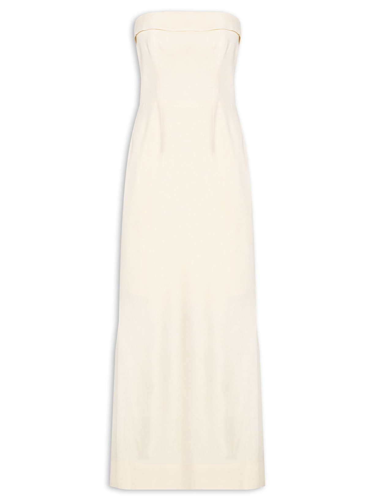 O vestido bege é confeccionado em tecido leve com toque de linho sem elasticidade. A peça de modelo tomara que caia justa na altura do busto e da cintura e solta no comprimento possui decote reto com sobreposição na parte frontal, recorte posterior em lastex, pences e recortes nas partes posterior e frontal, sem bojo, meio forro, fendas laterais, leve transparência, comprimento midi e fechamento posterior por zíper invisível.