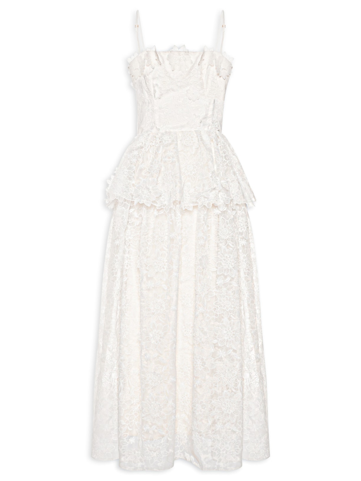 O vestido branco é confeccionado em organza sem elasticidade. A peça solta ao corpo possui decote reto, alças finas com regulagem na parte posterior, tecido aplicado na cintura para efeito de babados, aplicações de flores 3D, forro, lastex aplicado na parte posterior, comprimento midi e fechamento posterior por zíper.