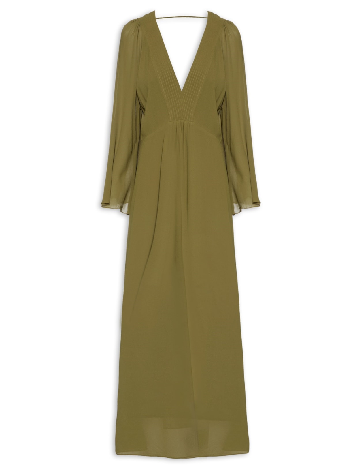 O vestido verde é confeccionado em tecido leve sem elasticidade. A peça solta ao corpo possui decote V frontal e posterior com recorte e detalhe de pespontos, mangas longas, recorte com efeito franzido, fendas laterais, forro e comprimento midi.