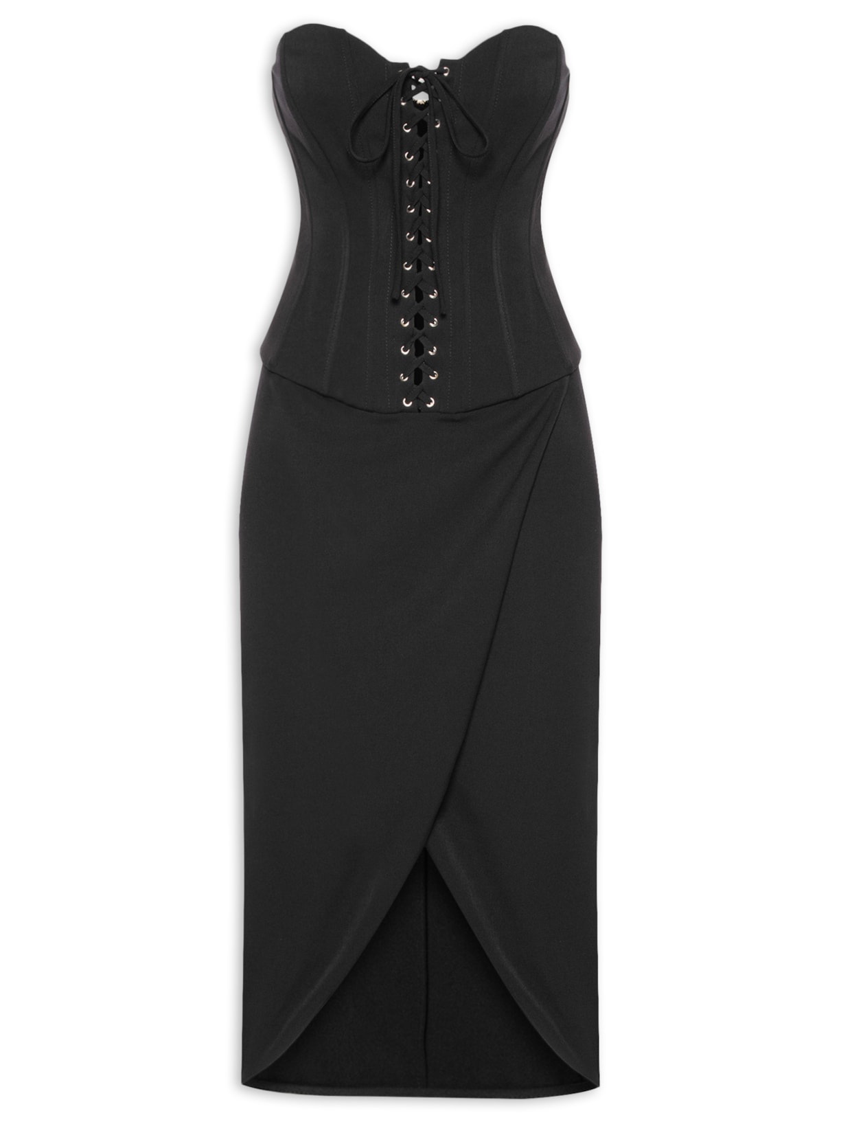 O vestido preto é confeccionado em tecido leve sem elasticidade. A peça justa ao corpo de modelo tomara que caia possui decote coração, recortes frontais e posteriores com barbatanas embutidas, recorte frontal com aplicação de ilhóses e tira alongada cruzada na parte frontal, fenda frontal, forro superior, sem bojo, comprimento midi e fechamento posterior em zíper.