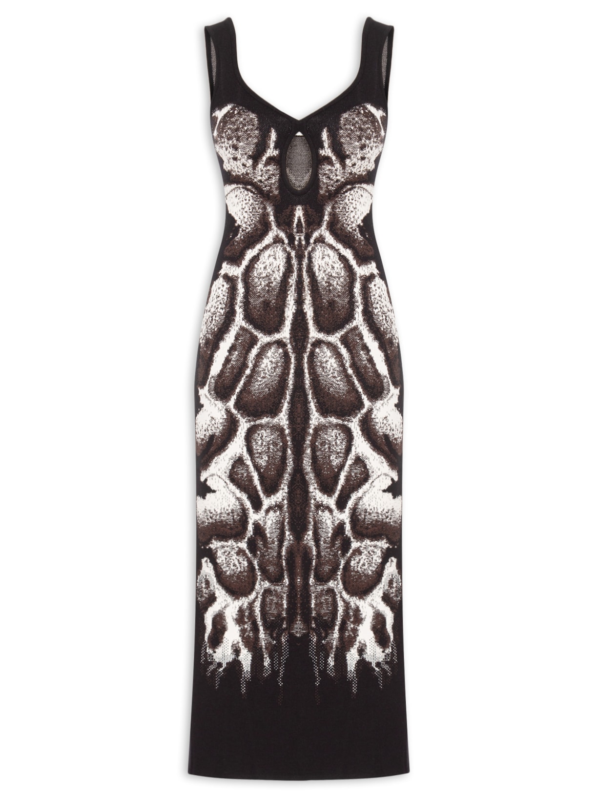 O vestido marrom é confeccionado em tricot com alta elasticidade. A peça justa ao corpo possui decote V, alças médias, cavas regulares, recorte frontal vazado, sem bojo, padronagem abstrata em cores contrastantes, recorte posterior com fenda e comprimento midi.
