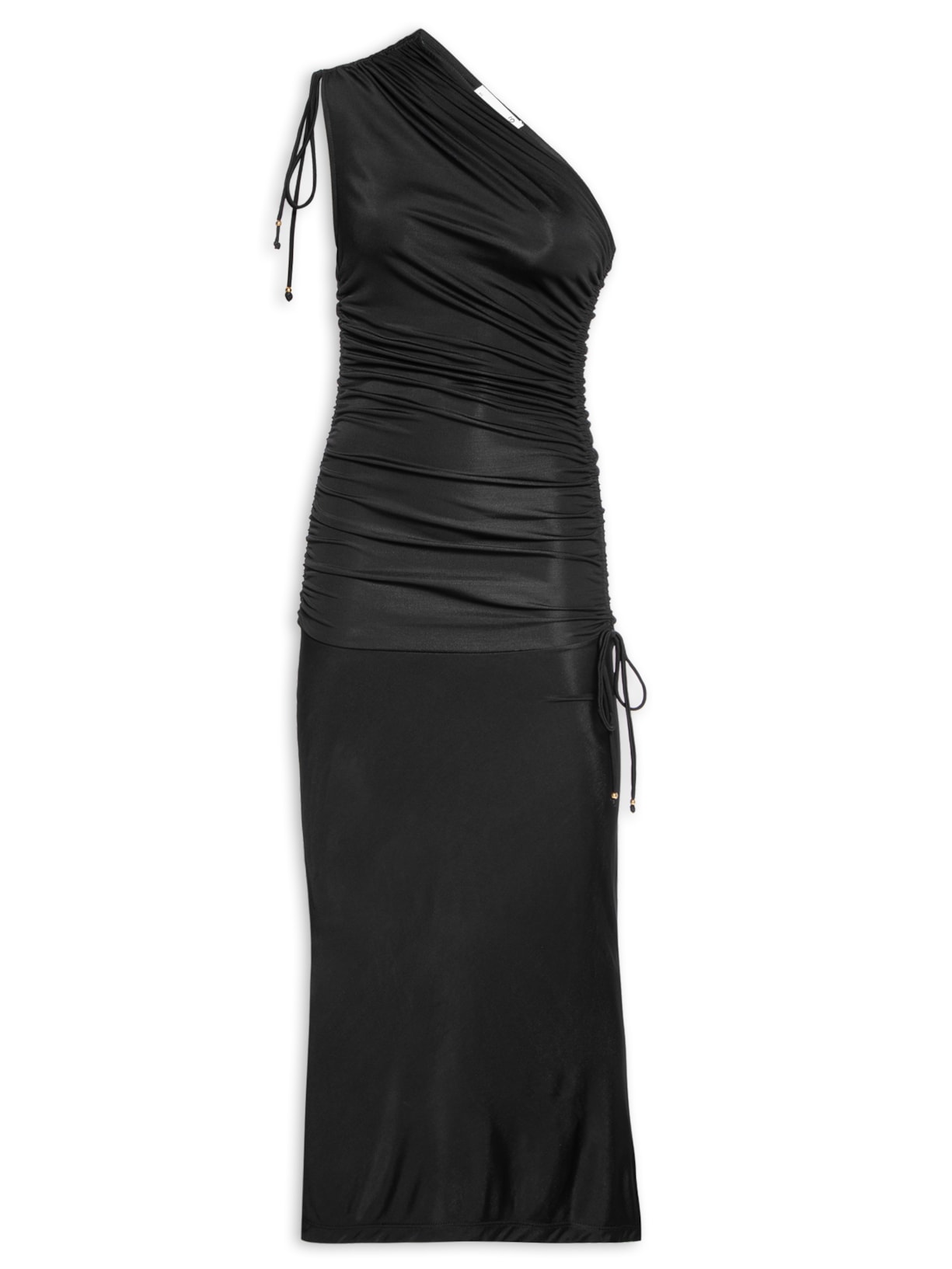 O vestido preto é confeccionado em malha com alta elasticidade. A peça justa ao corpo possui decote ombro único, alça larga, cava regular, cordão embutido para amarração na altura do ombro e na parte lateral, sem bojo, recorte posterior e frontal na altura do quadril, drapeado nas partes posterior e frontal, detalhe de franzidos na altura do ombro e nas partes laterais e comprimento midi.