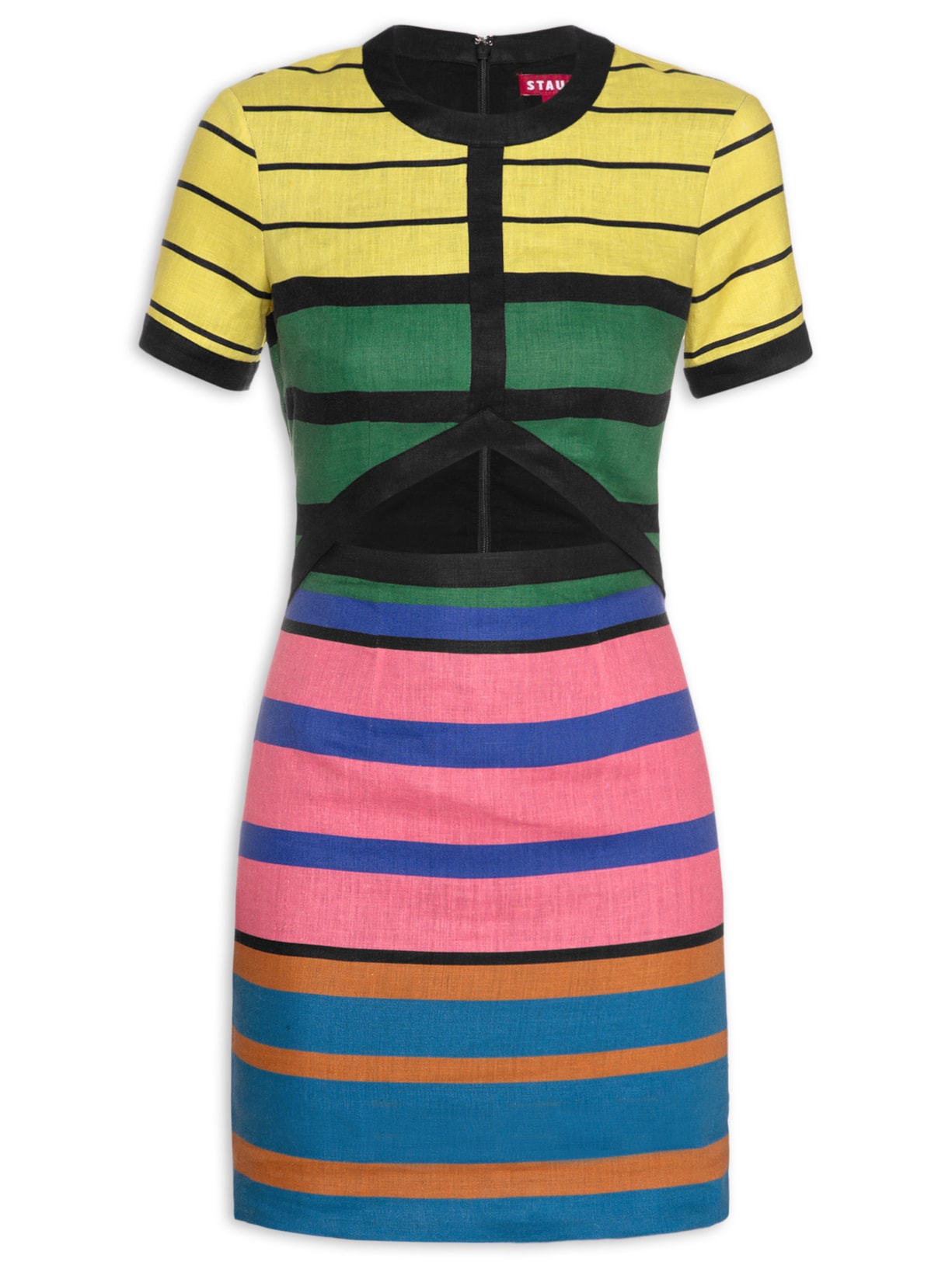 O vestido rosa é confeccionado em tricot. A peça possui decote redondo, mangas curtas, pences frontais na altura do busto, recorte frontal vazado na altura da cintura, padronagem de listras em cor contrastante e tamanhos variados, forro, comprimento mini, shape justo e fechamento posterior por zíper invisível.