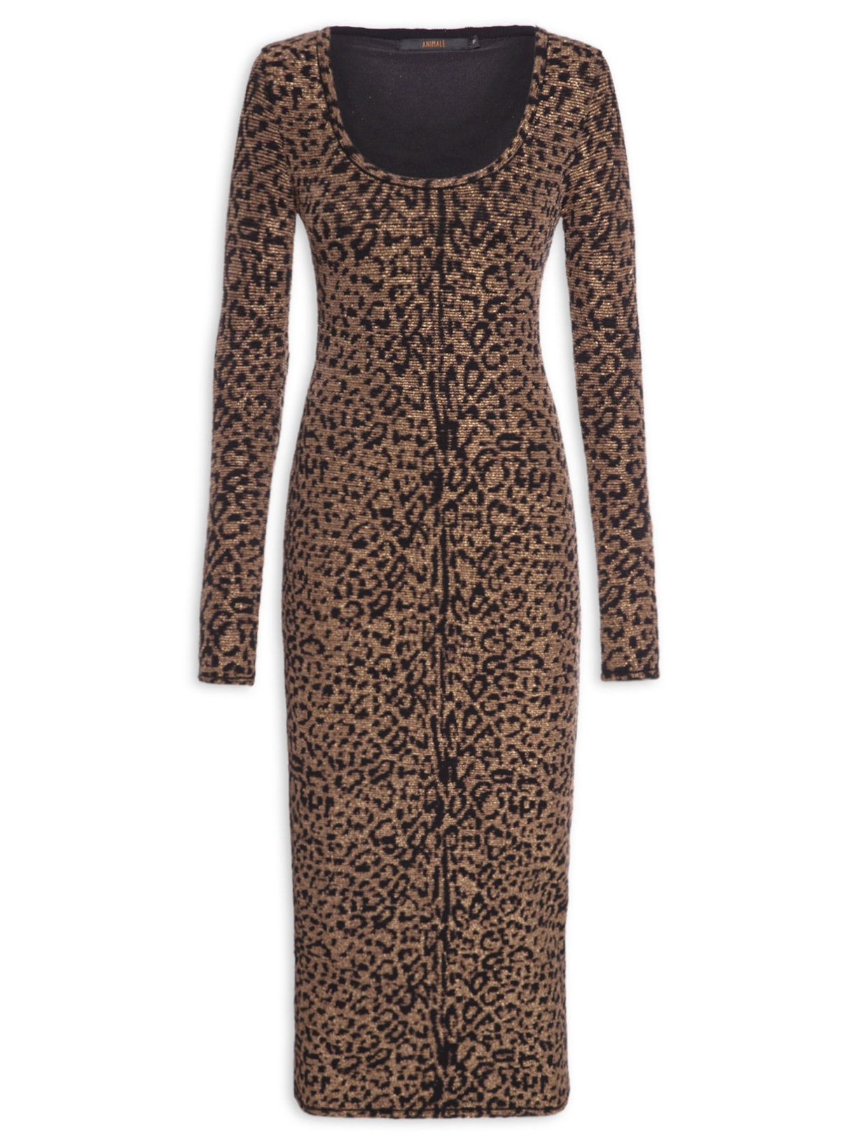 O vestido animal print é confeccionado em tricot com fios de lurex, superfície texturizada e alta elasticidade. A peça justa ao corpo possui decote U, mangas longas, forro, sem bojo e comprimento midi.