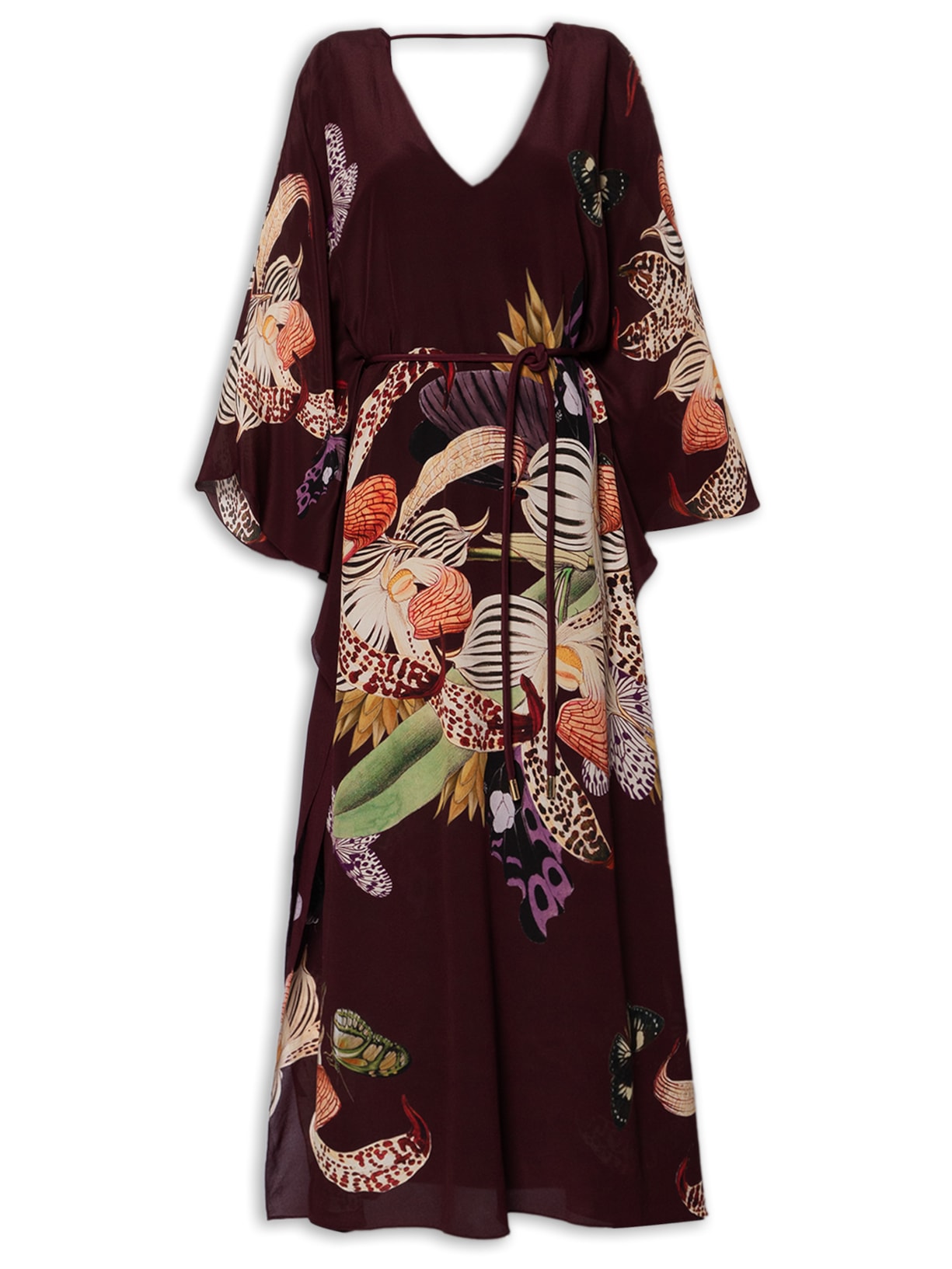 O vestido vermelho é confeccionado em seda sem elasticidade. A peça de modelo amplo é solta ao corpo possui decote V, mangas curtas, cordão embutido na altura da cintura, mix de estampas, decote posterior em V, fendas laterias, forro e comprimento midi.