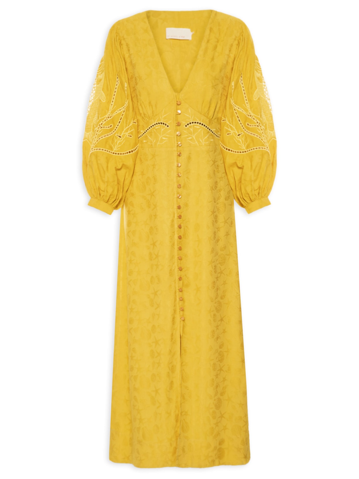 O vestido amarelo é confeccionado em tecido leve sem elasticidade. A peça solta ao corpo possui decote V profundo, mangas longas bufantes com detalhes de franzidos e abotoamento nos punhos, recorte com detalhes de franzidos na parte frontal do busto, bordado richelieu na parte frontal da cintura e nas mangas, padronagem figurativas em tom contrastante, forro, comprimento midi e fechamento frontal por botões.