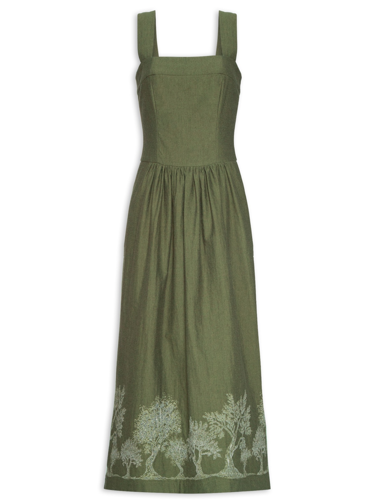 O vestido verde é confeccionado em tecido leve sem elasticidade. A peça justa na altura do busto e da cintura e solta no comprimento possui decote quadrado, alças médias, cavas regulares, recorte posterior, recorte na altura da cintura com detalhe de franzido, bolsos frontais embutidos, recortes frontais, padronagem figurativa de árvores em cores contrastantes na altura da barra, forro, sem bojo, comprimento midi e fechamento posterior por zíper.