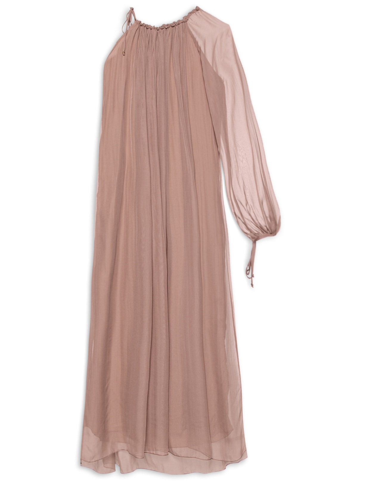 O vestido bege é confeccionado em seda sem elasticidade. A peça solta ao corpo possui decote ombro único com franzidos, manga longa bufante com transparência, forro, alça fina regulável por amarração, transparência, comprimento midi e não possui fechamento.