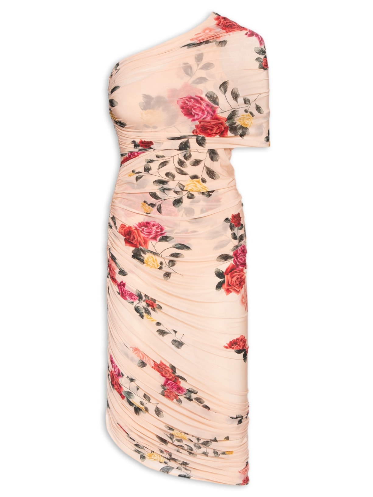 O vestido bege é confeccionado em malha leve de alta elasticidade. A peça justa ao corpo possui decote ombro único, parte superior estendida para manga curta com recorte vazado na altura da cintura, laterais franzidas, barra assimétrica, estampa floral em cores contrastantes, transparência, forro em body solto e comprimento midi. O forro justo ao corpo possui decote ombro único, alça média, estampa floral em cores contrastantes, transparência, tecido duplo e fechamento inferior em botões de pressão.