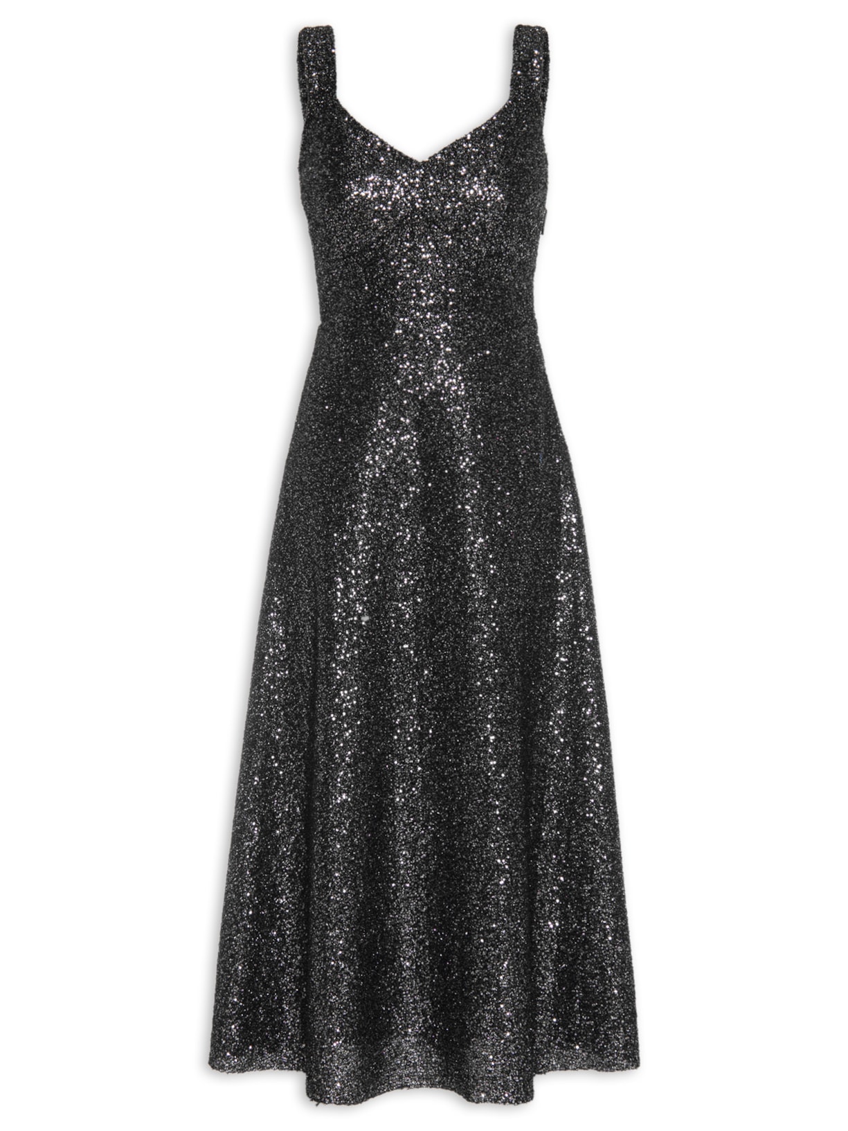 O vestido preto é confeccionado em tecido encorpado com superfície levemente texturizada e aplicação de mini paetês metalizados. A peça de modelo godê possui decote em V, alças largas, recorte na altura da cintura, recorte no busto, forro, comprimento midi, caimento reto, acabamento pespontado e fechamento lateral por zíper.