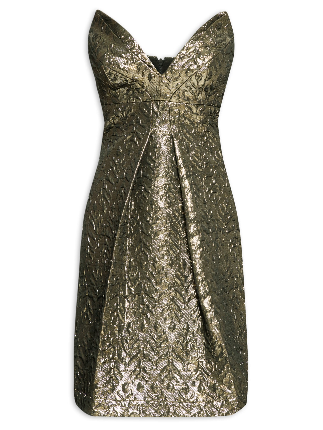 O vestido dourado é confeccionado em tecido leve com fios de lurex, superfície texturizada e sem elasticidade. A peça justa ao busto e solta ao comprimento de modelo tomara que caia possui decote V com detalhe drapeado, recortes frontais, prega frontal, pences posteriores, padronagem abstrata em relevo, forro, comprimento curto e fechamento posterior por zíper invisível.