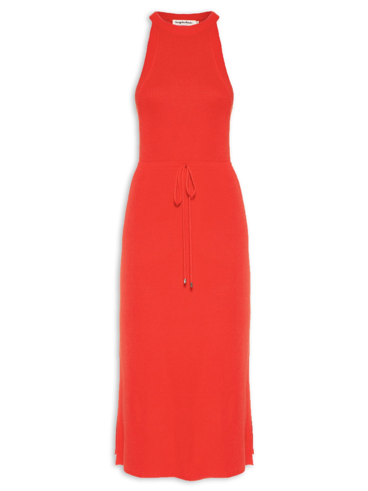 O vestido vermelho é confeccionado em tricot. A peça possui decote redondo, alças finas, cavas estendidas, cordão embutido na altura da cintura para amarração frontal, fendas laterais, comprimento midi e shape solto.