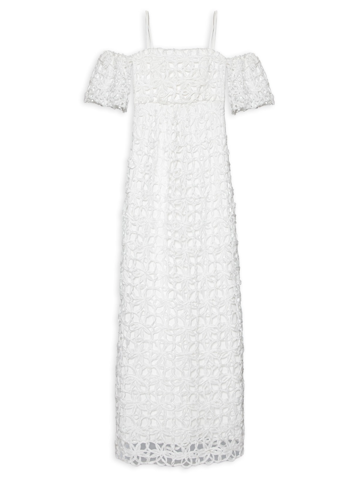 O vestido branco é confeccionado em tela com superfície texturizada e sem elasticidade. A peça solta ao corpo possui decote reto, alças finas, mangas curtas com elástico embutidos, recorte posterior, forro, fechamento por zíper posterior e comprimento longo.