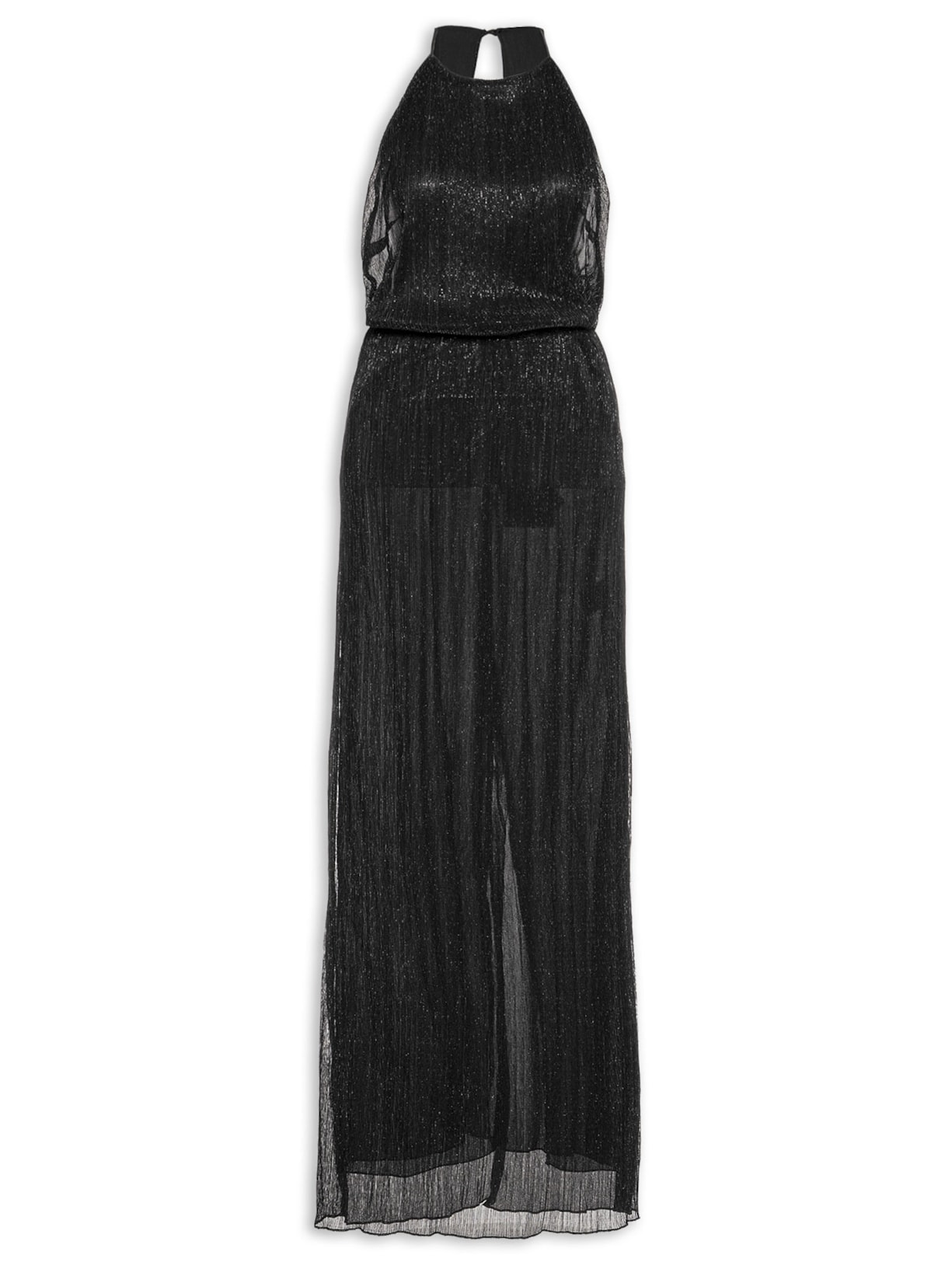 O vestido preto é confeccionado em tecido leve com lurex. A peça possui decote trapézio, alças finas, recorte posterior vazado, cavas estendidas, recorte com faixa elástica embutida na altura da cintura, forro, transparência, comprimento longo, shape justo, caimento reto, acabamento pespontado e fechamento posterior por botão.