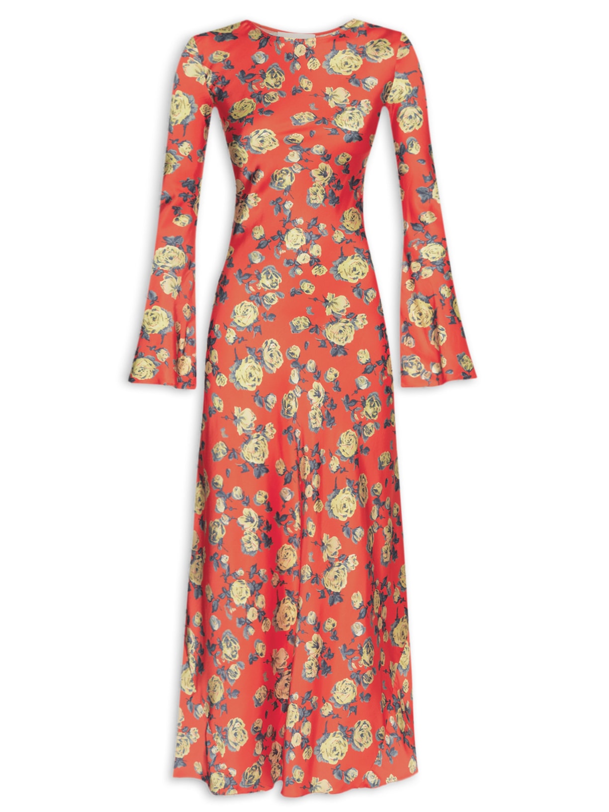 O vestido laranja é confeccionado em tecido leve com superfície acetinada de baixa elasticidade. A peça justa ao corpo, possui decote redondo, mangas longas de modelo sino, estampa floral em cores contrastantes, comprimento longo e sem fechamento.