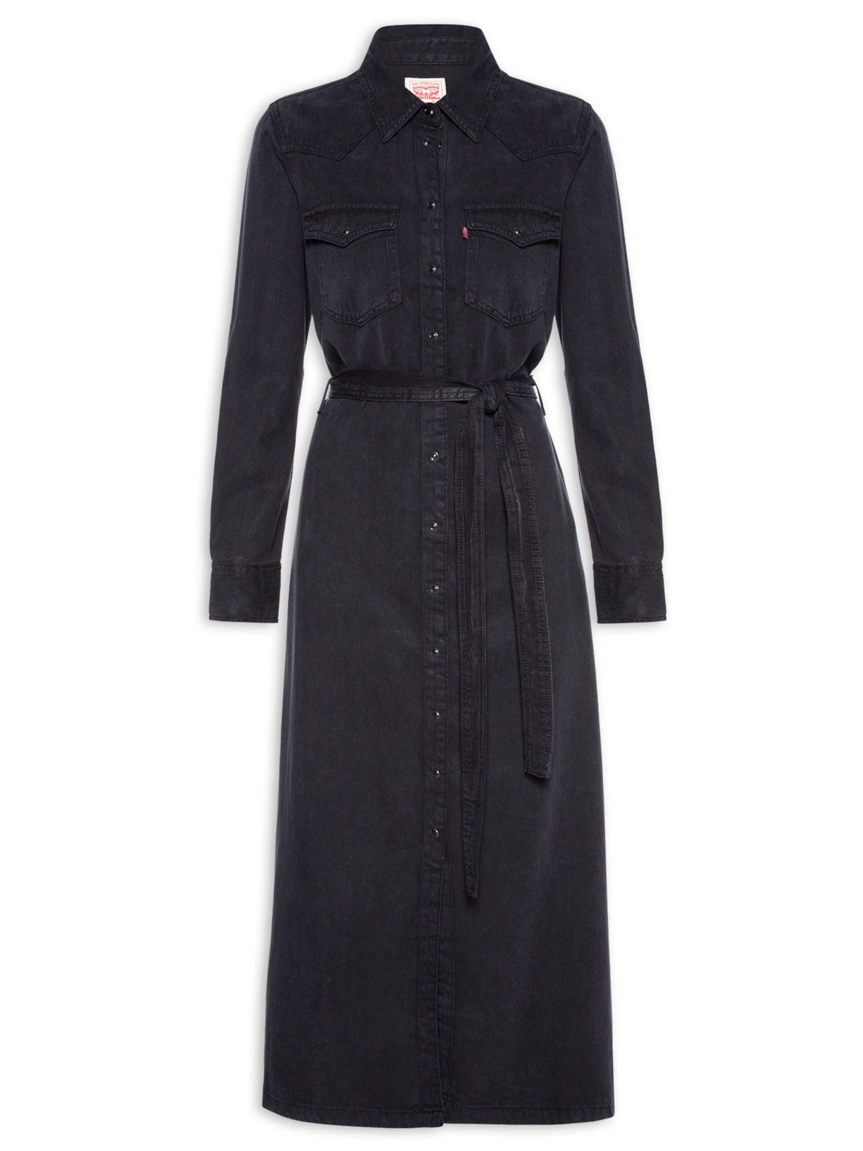 O vestido preto é confeccionado em sarja sem elasticidade. A peça solta ao corpo, possui colarinho clássico, mangas longas com abotoamento nos punhos, recortes frontais, bolsos frontais com tag da marca aplicada e fechamento por aba e botão de pressão, bolsos frontais embutidos, passantes aplicados na cintura, recortes posteriores, comprimento midi e fechamento frontal por botões metálicos. Acompanha faixa em mesmo tecido para amarração opcional.