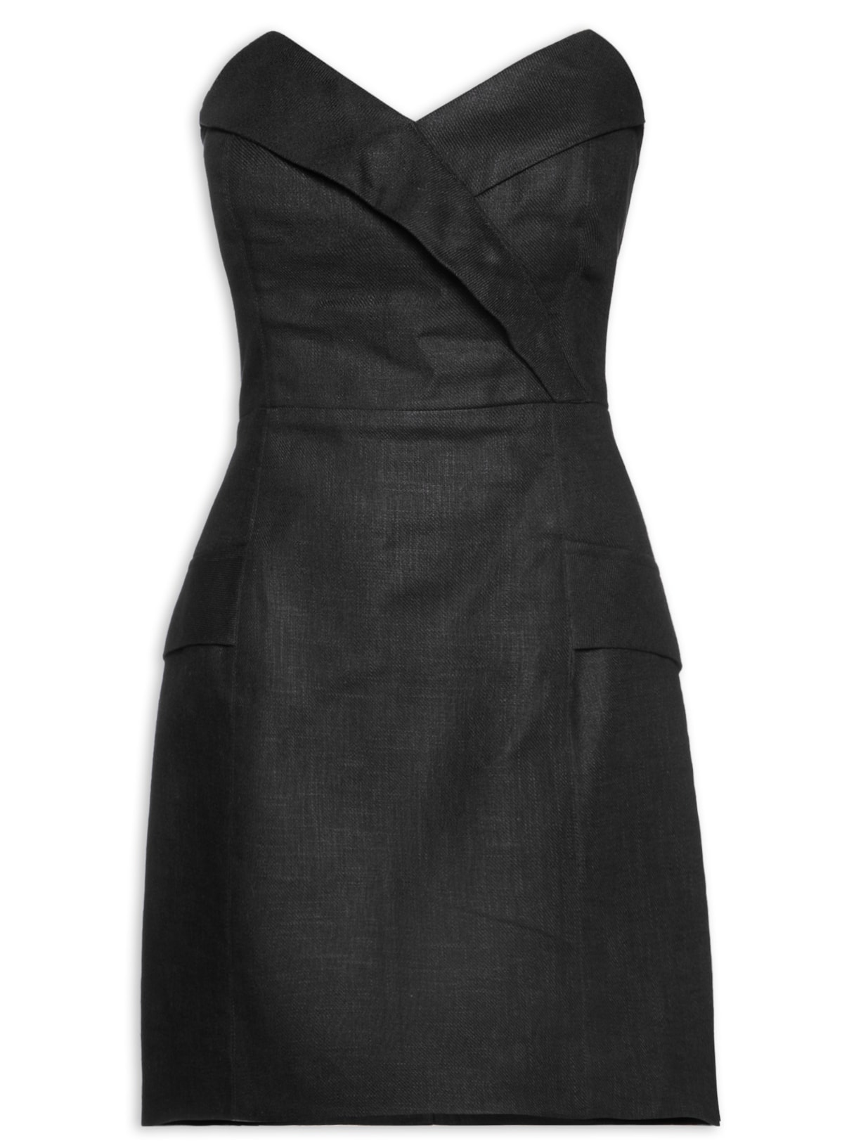 O vestido preto é confeccionado em tecido leve sem elasticidade. A peça de modelo tomara que caia justa na altura do busto e da cintura e solta no comprimento possui decote V, recorte posterior em lastex, recortes posteriores e frontais, vistas sobrepostas na parte frontal, sem bojo, detalhe de assimetria na parte frontal, forro, comprimento curto e fechamento posterior por zíper.