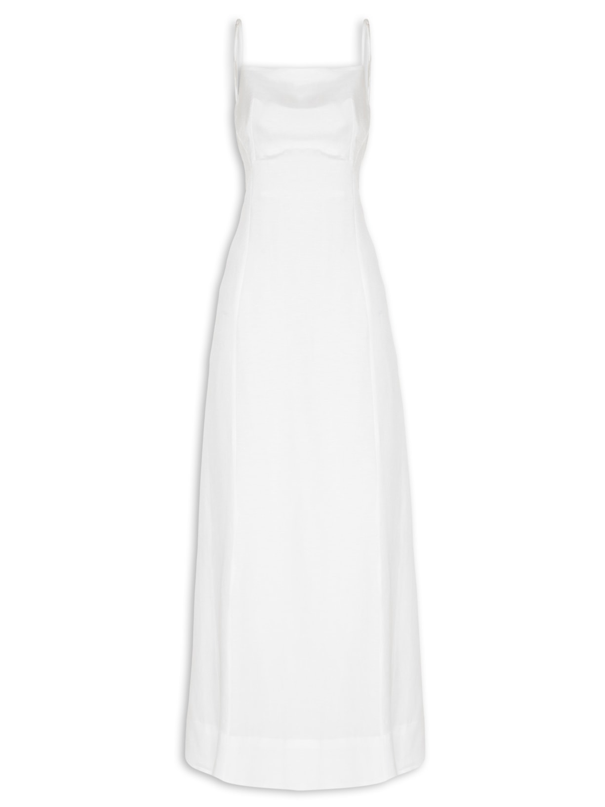 O vestido branco é confeccionado em tecido leve com toque de linho sem elasticidade. A peça solta ao corpo possui decote reto, alças finas com regulagem, cavas estendidas, recortes frotais, forro, comprimento midi e fechamento posterior por zíper invisível.