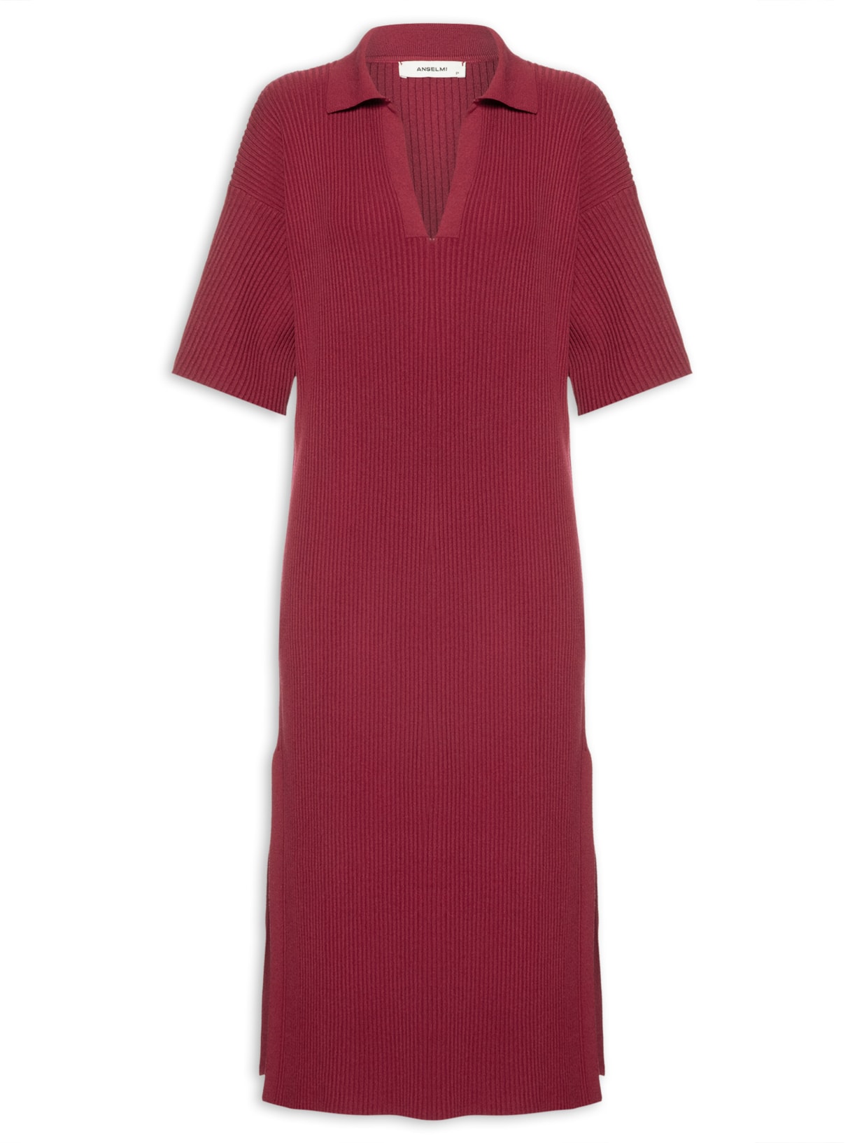 O vestido vermelho é confeccionado em tricot com superfície canelada e alta elasticidade. A peça solta ao corpo possui gola esporte, mangas 3/4, ombros estendidos, fendas laterais e comprimento midi.