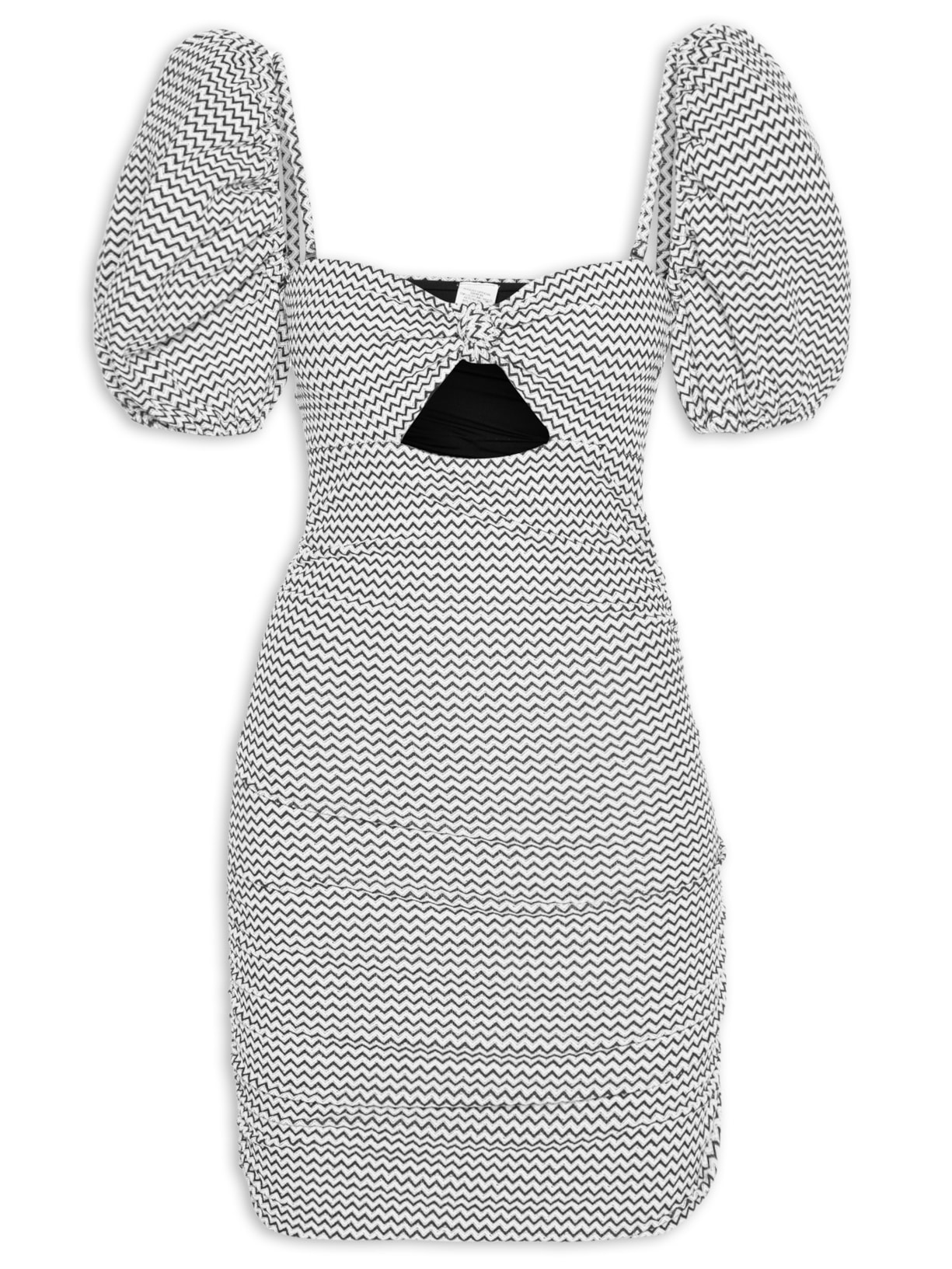 O vestido preto é confeccionado em malha de poliamida com superfície texturizada e de alta elasticidade. A peça justa ao corpo possui decote coração, alças finas reguláveis, mangas curtas e bufantes removíveis por botão, recorte frontal vazado com detalhe de nó na altura do busto, efeito franzido nas laterais, padronagem chevron em cor contrastante, forro, sem bojo e comprimento curto.