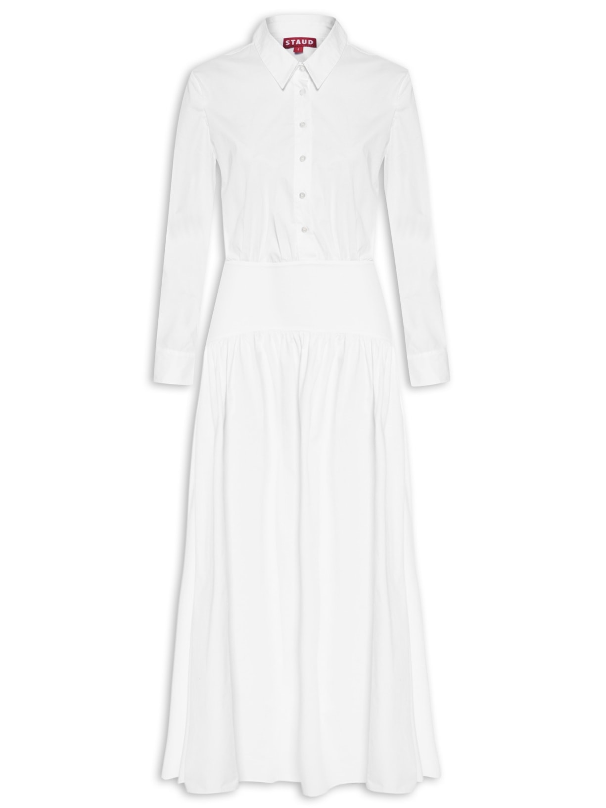 O vestido branco é confeccionado em tecido leve sem elasticidade. A peça justa na altura da cintura e solta no comprimento possui colarinho simples, mangas longas com abotoamento nos punhos, recorte posterior, recorte na altura da cintura e do quadril com detalhe de franzido, recorte frontal, comprimento longo e fechamento lateral por zíper e frontal por botões.