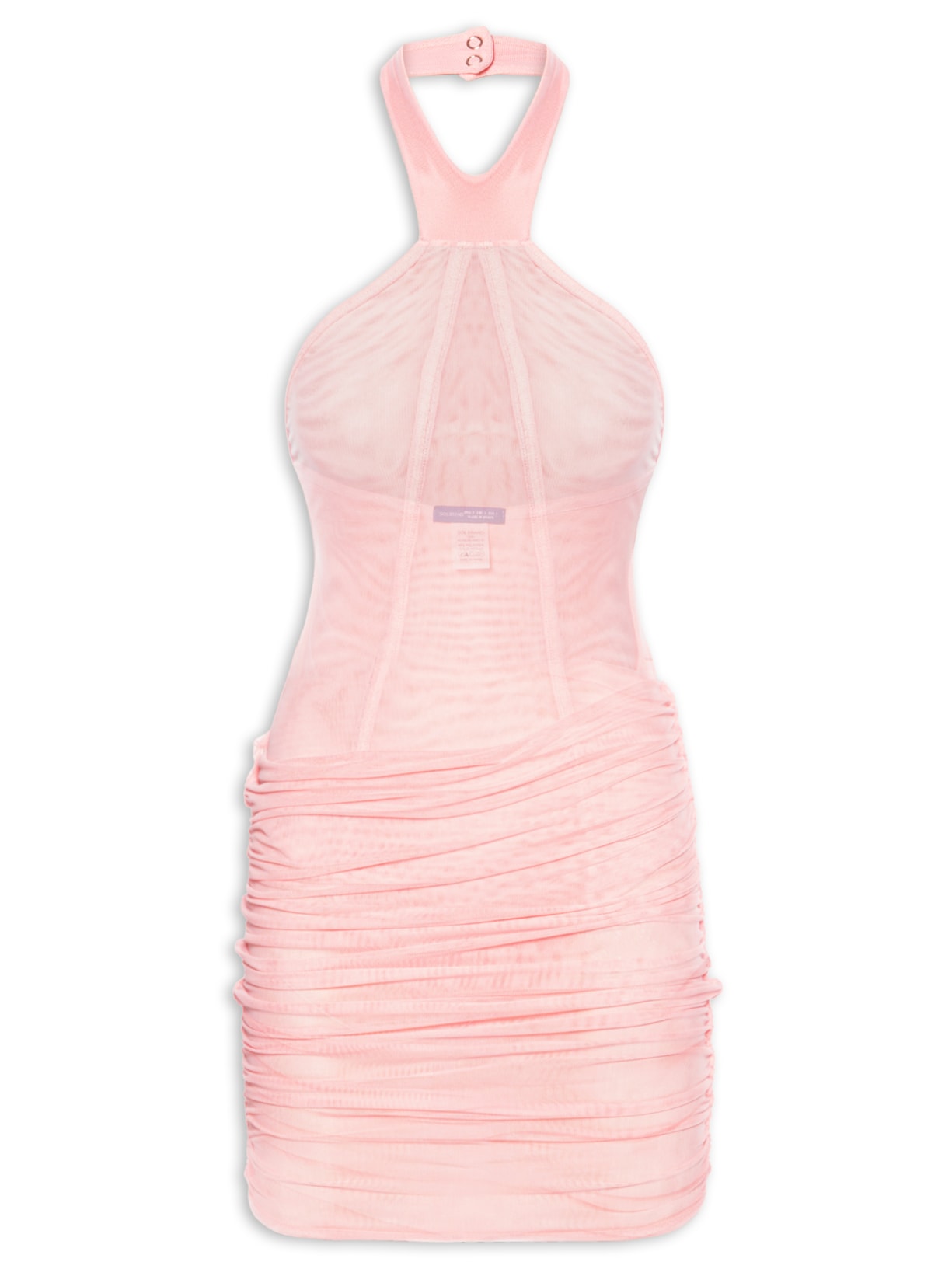 O vestido rosa é confeccionado em tule com média elasticidade. A peça justa ao corpo possui decote halter frente única, parte interna em modelo de body com fechamento inferior por botão de pressão, saia curta com franzido nas laterais e efeito drapeado, recortes frontal, leve transparência, comprimento curto e fechamento posterior por botões de pressão na altura do pescoço.