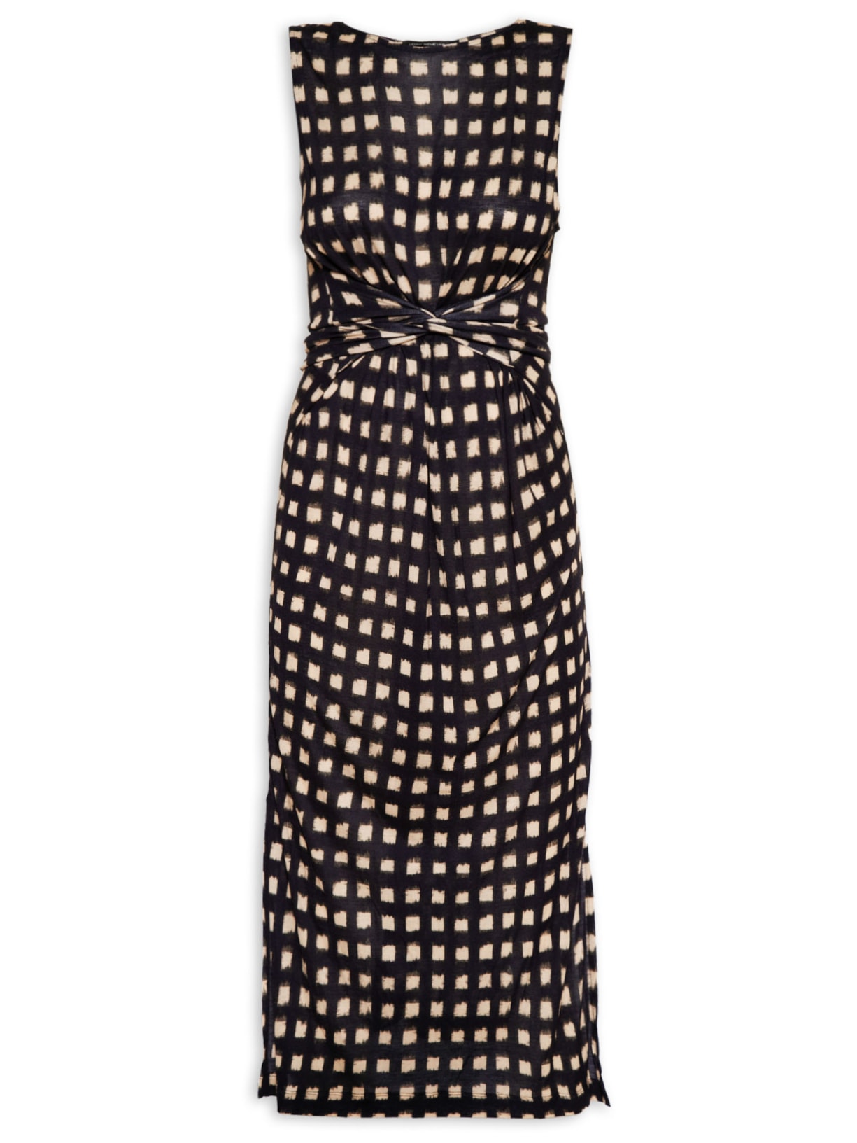 O vestido saída preto é confeccionado em malha leve. A peça possui decote canoa, alças médias, cavas regulares, estampa em cor contrastante, faixas laterais estendidas para amarração frontal, fendas laterais, comprimento midi e shape solto.