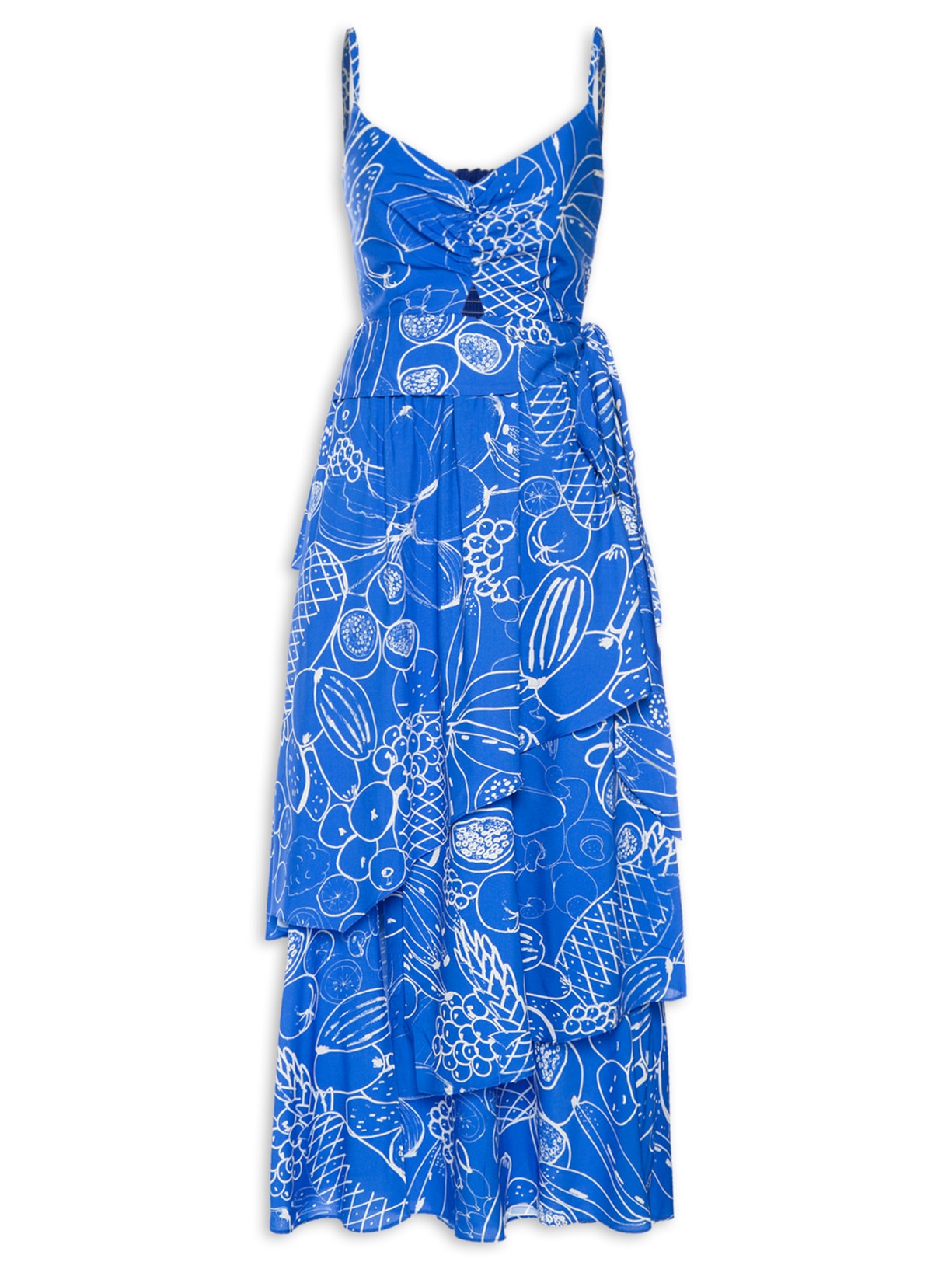 O vestido azul é confeccionado em tecido leve sem elasticidade. A peça justa no busto e solta no corpo possui decote em V arredondado com detalhe de franzidos frontais, alças finas, recorte frontal vazado, recorte posterior em lastex com logo da marca aplicado em metal, recorte sobreposto na altura da cintura com faixas estendidas para amarração lateral, recortes sobrepostos em camadas no comprimento, fenda frontal, estampa figurativa de frutas em cor contrastante, forro, comprimento midi e fechamento lateral por zíper invisível.