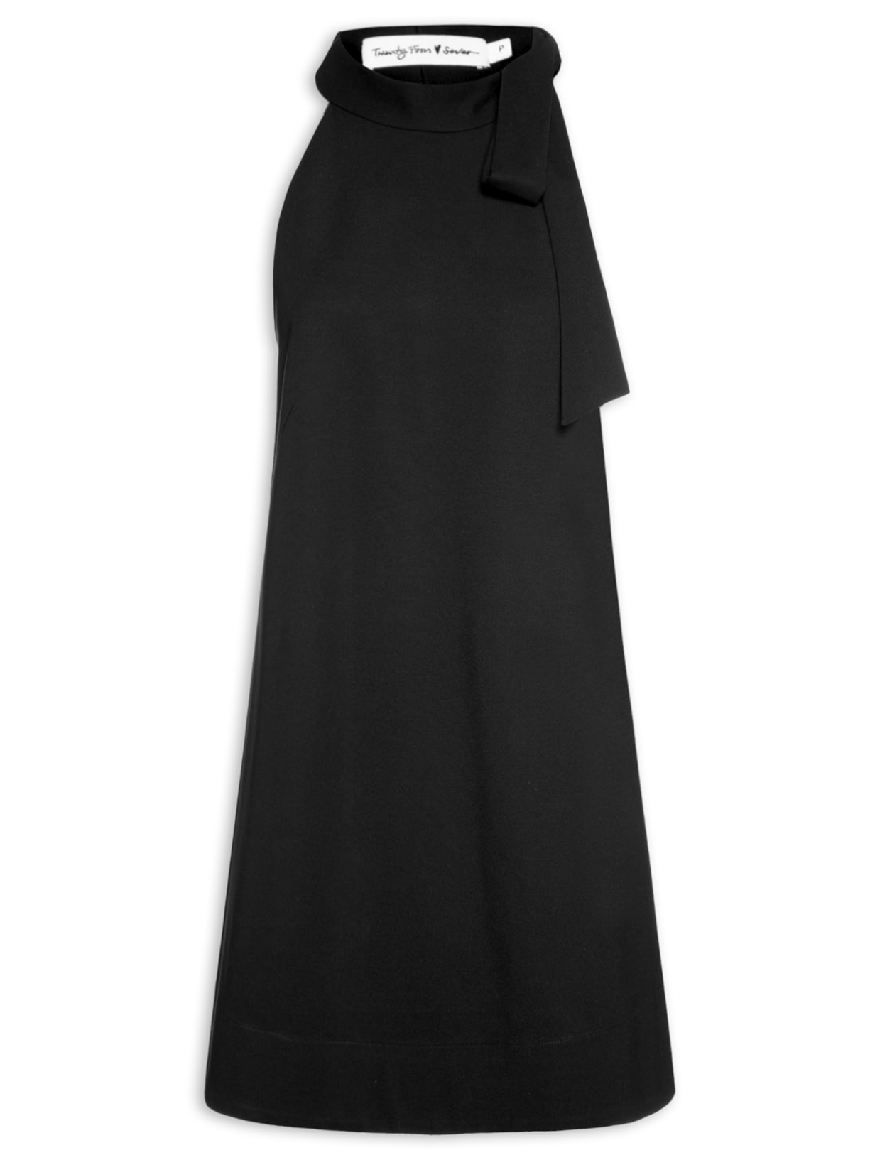 O vestido preto é confeccionado em malha encorpada com baixa elasticidade. A peça solta ao corpo possui decote halter, alças médias em tiras alongadas para amarração, pences frontais na altura do busto, forro e comprimento curto.
