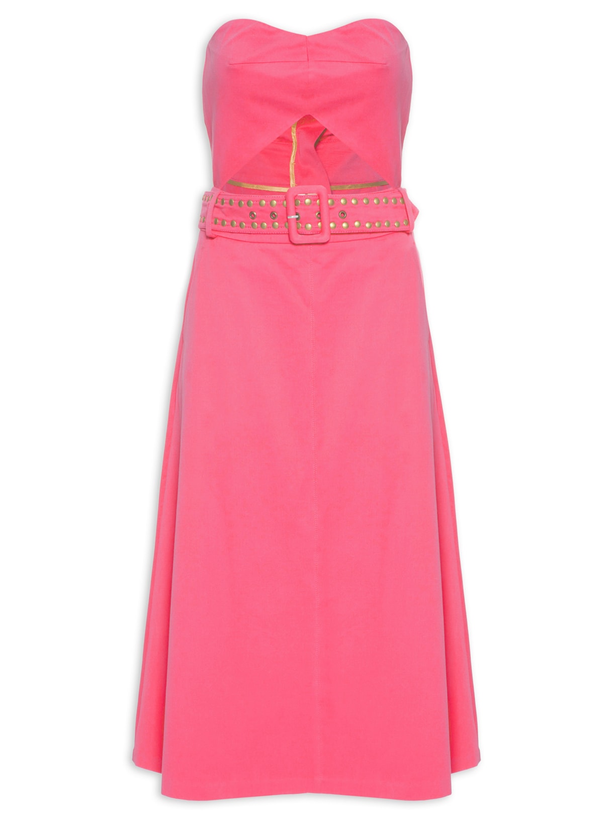 O vestido rosa é confeccionado em tecido encorpado. A peça de modelo tomara que caia possui decote coração, recorte na altura da cintura com passantes aplicados, pences posteriores, bolsos frontais, comprimento midi, caimento reto, acabamento pespontado e fechamento posterior por zíper.