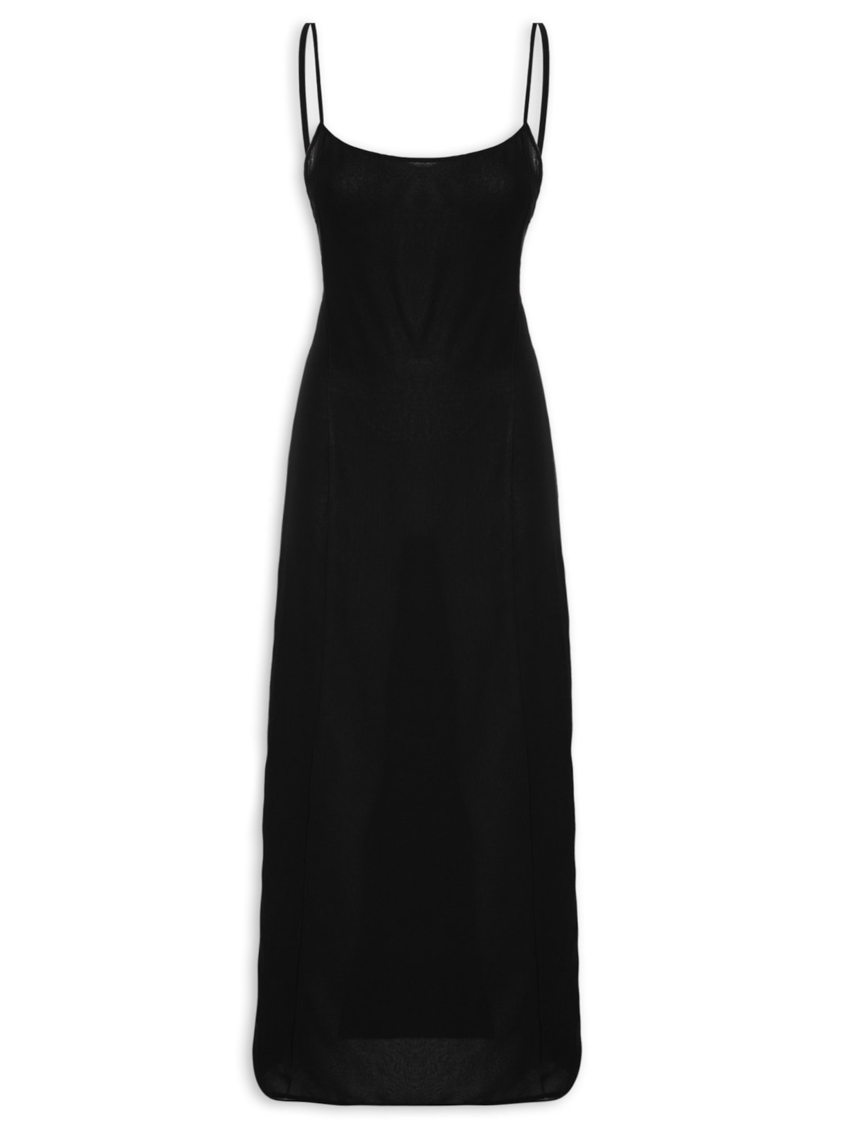 O vestido preto  é confeccionado em seda. A peça possui decote quadrado, alças finas, cavas regulares, fendas laterais, comprimento midi, shape solto, caimento reto, acabamento pespontado e fechamento posterior por amarração.