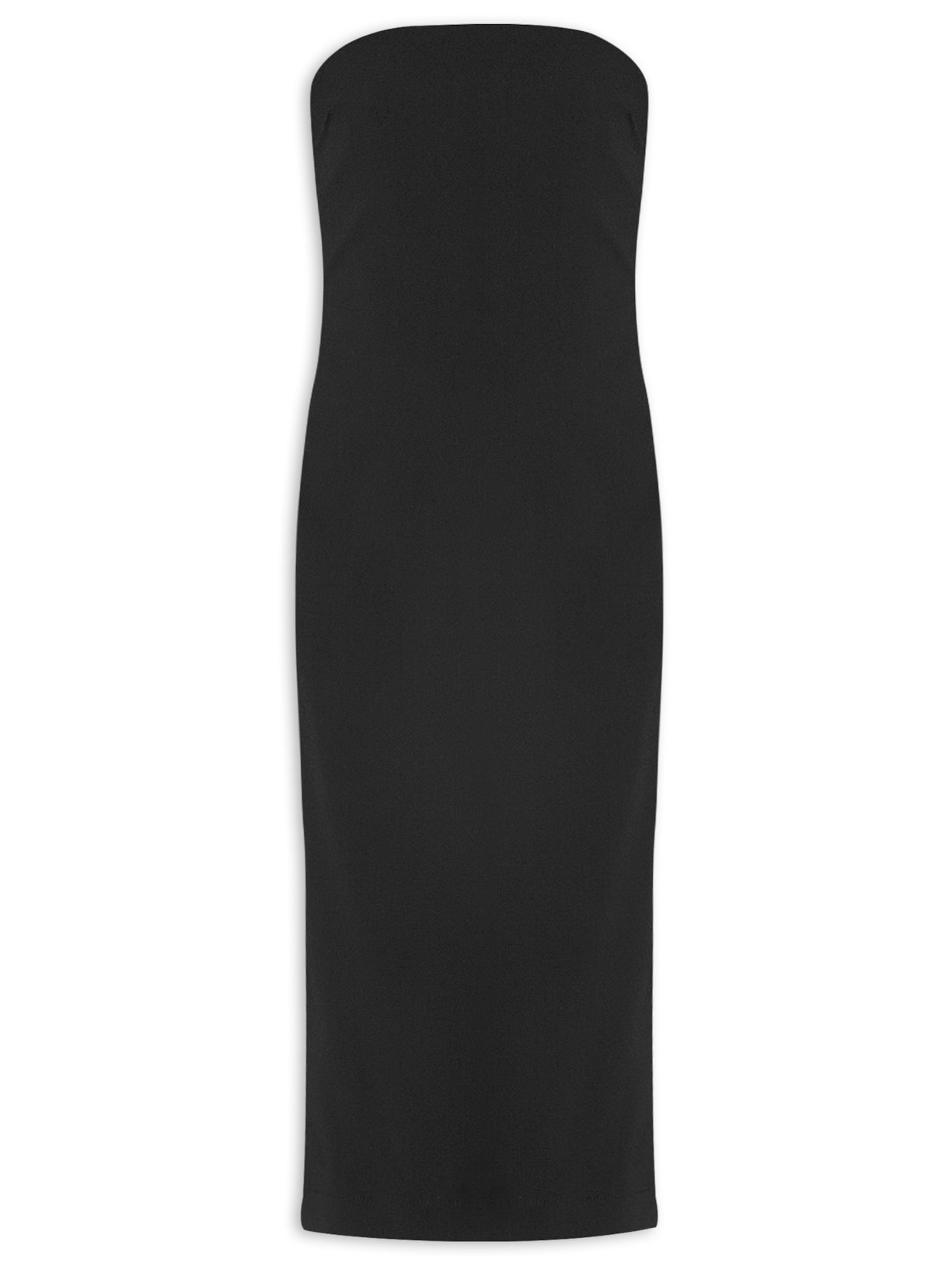 O vestido preto é confeccionado em crepe sem elasticidade. A peça justa ao corpo de modelo tomara que caia possui decote reto, pences frontais, recorte posterior, pences posteriores, forro, bojo, comprimento midi e fechamento posterior por zíper.