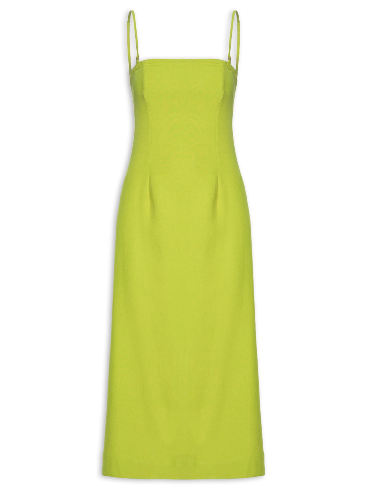 O vestido verde é confeccionado em tecido leve com toque de linho sem elasticidade. A peça solta ao corpo possui decote reto, alças finas com regulagem e removíveis, sem bojo, recorte posterior em lastex, comprimento midi, fenda posterior e fechamento posterior por zíper invisível.
