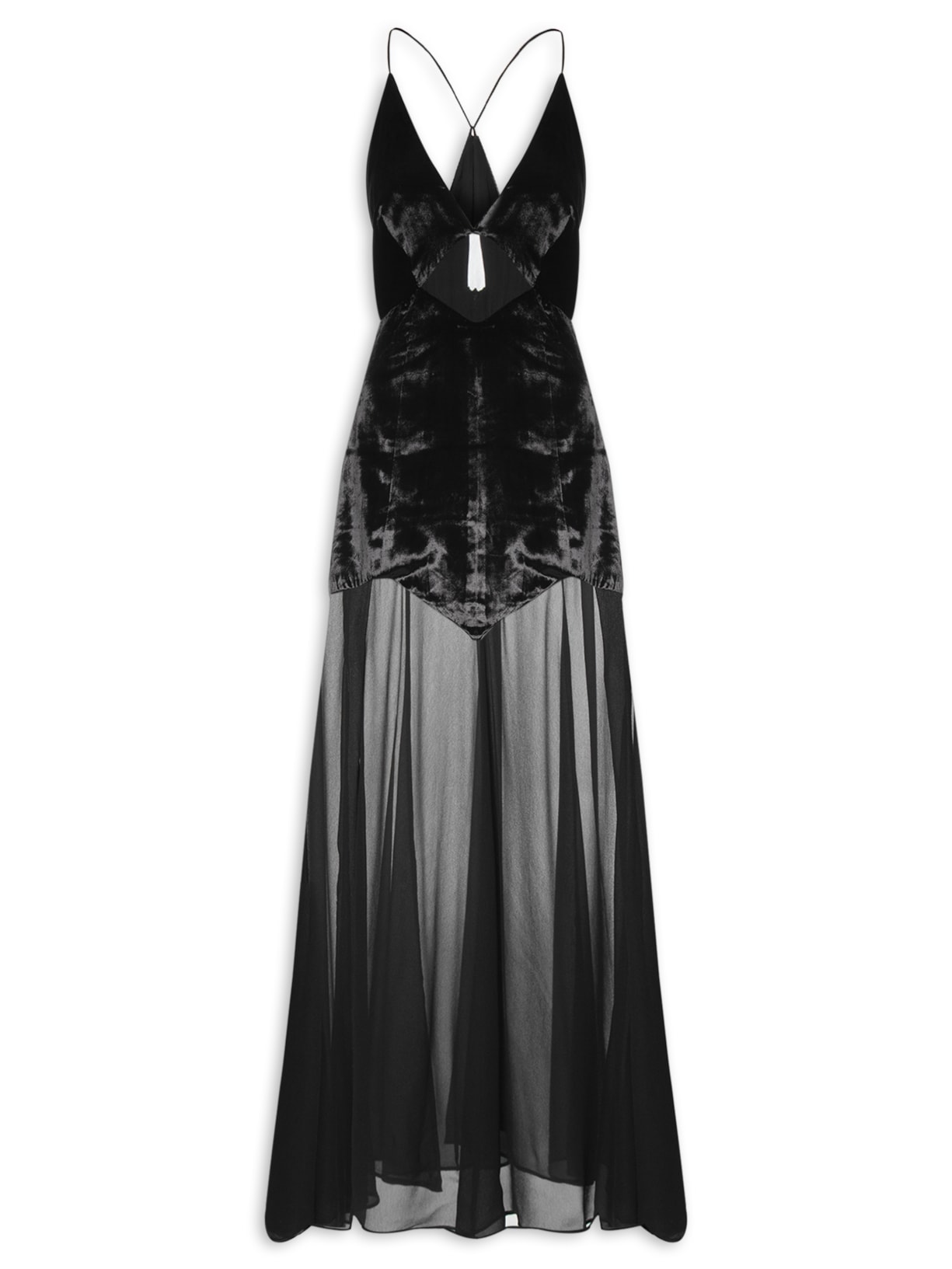 O vestido preto é confeccionado em veludo molhado com toque de seda sem elasticidade. A peça justa ao corpo, possui decote em V, alças finas cruzadas na parte posterior, recortes frontais, recorte em tecido com transparência na parte frontal da cintura e na parte inferior com assimetria, recorte posterior com leve franzido, fendas laterais, comprimento longo, forro superior e fechamento posterior por zíper invisível.
