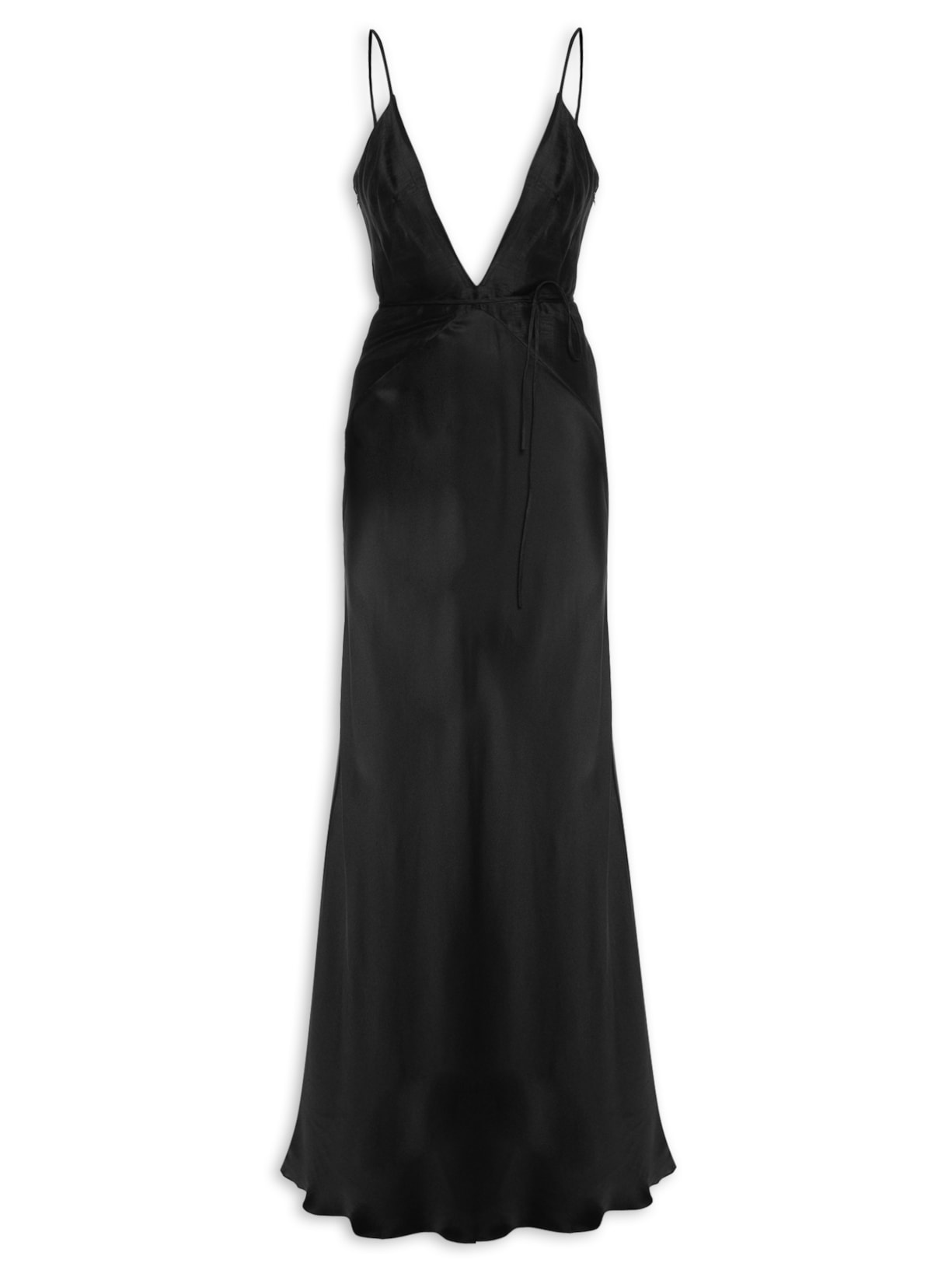 O vestido preto é confeccionado em organza sem elasticidade. A peça solta ao corpo possui decote V profundo, alças finas, recortes frontais e posteriores, parte inferior com superfície acetinada, parte superior com leve transparência e tecido duplo, comprimento longo e fechamento lateral por zíper invisível. Acompanha cinto em tira fina e alongada da mesma cor e tecido para amarração opcional.