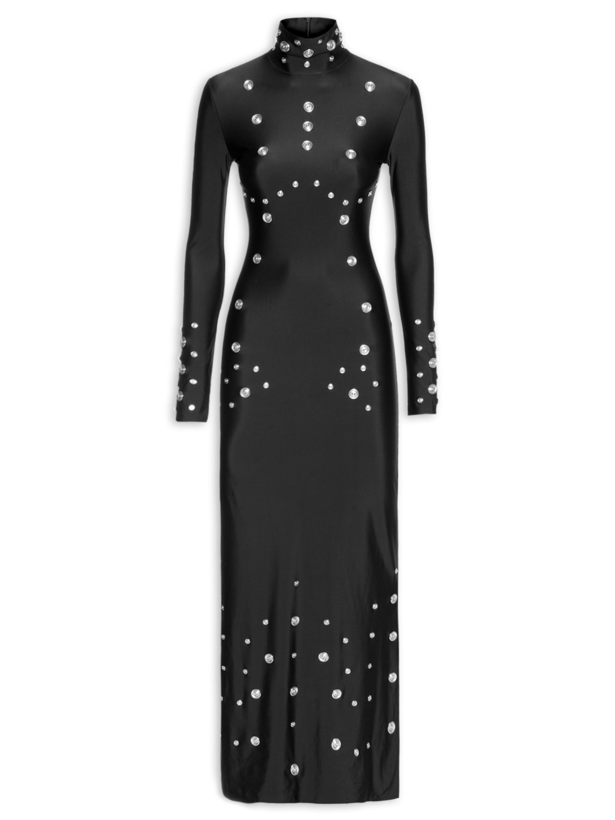 O vestido preto é confeccionado em malha cirrê com média elasticidade. A peça justa ao corpo possui gola alta, mangas longas, fenda posterior, aplicação de botões de pressão metálicos e decorativos com tamanhos distintos, comprimento longo e fechamento posterior por zíper invisível.