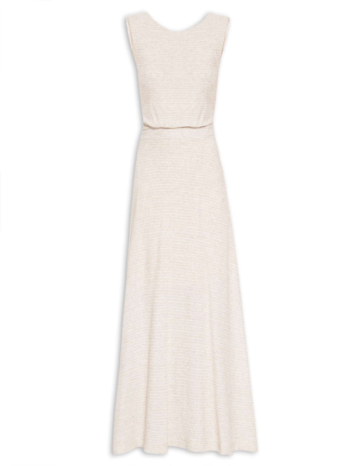 O vestido bege é confeccionado em tecido leve com superfície texturizada e fios de lurex com toque de linho e leve elasticidade. A peça solta ao corpo possui decote redondo com logo metalizado da marca aplicado na parte posterior, alças médias, cavas regulares, recorte posterior vazado, recorte com detalhes de franzidos na parte frontal e elástico embutido na parte posterior da cintura, meio forro e comprimento longo.
