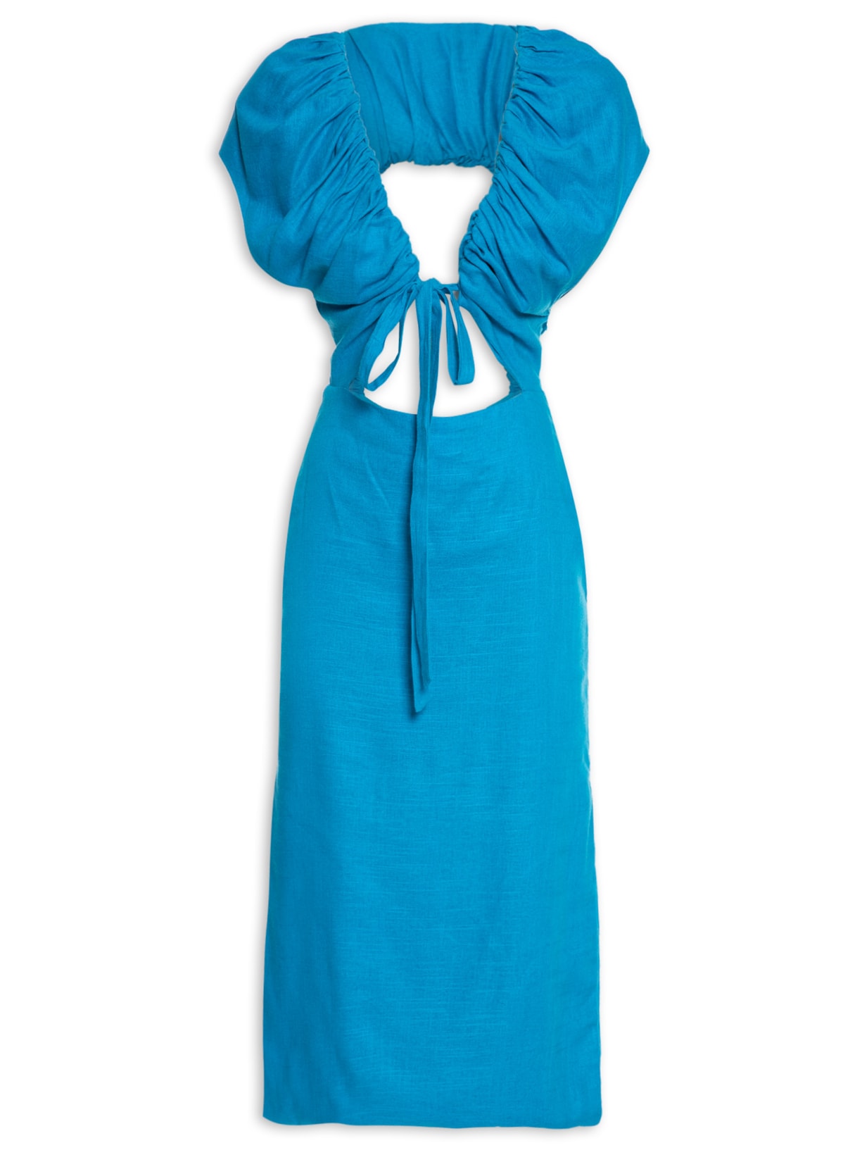 O vestido azul é confeccionado em tecido encorpado. A peça possui decote V com cordão embutido para amarração frontal e detalhe de franzidos, recorte posterior vazado com aplicação de elástico e detalhe de franzidos, ombreiras embutidas, ombros e cavas estendidos, recorte frontal vazado na altura da cintura, fendas laterais, comprimento midi, shape solto, caimento reto, acabamento pespontado e fechamento lateral por zíper invisível.