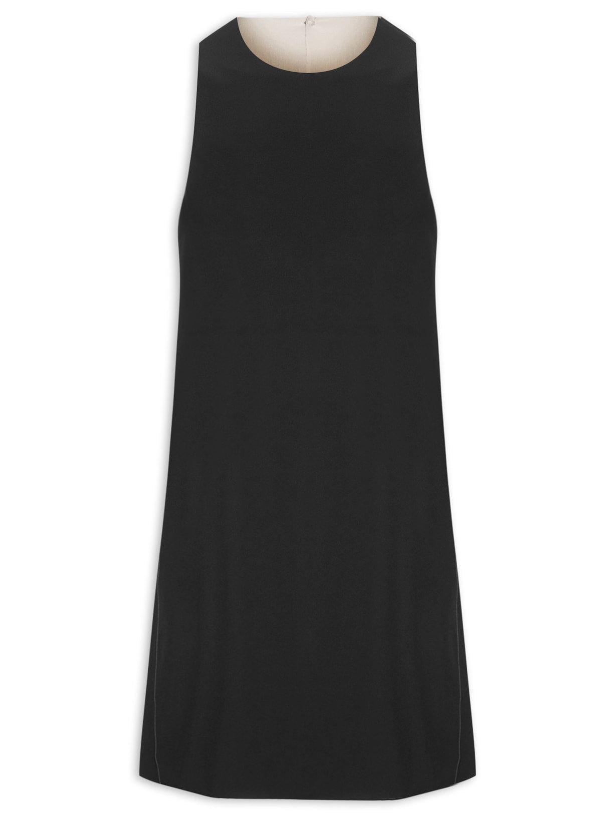 O vestido preto é confeccionado em tecido leve de baixa elasticidade. A peça solta ao corpo de modelo dupla face possui decote redondo, cavas estendidas, pences frontais, detalhe de costura sobreposta, acabamento em corte a fio, comprimento curto e fechamento posterior em recorte vazado com botão de pressão aplicado. A outra face possui tom contrastante, pences frontais, tag da marca aplicada na lateral com escrita em tom contrastante e detalhe de costura sobreposta.