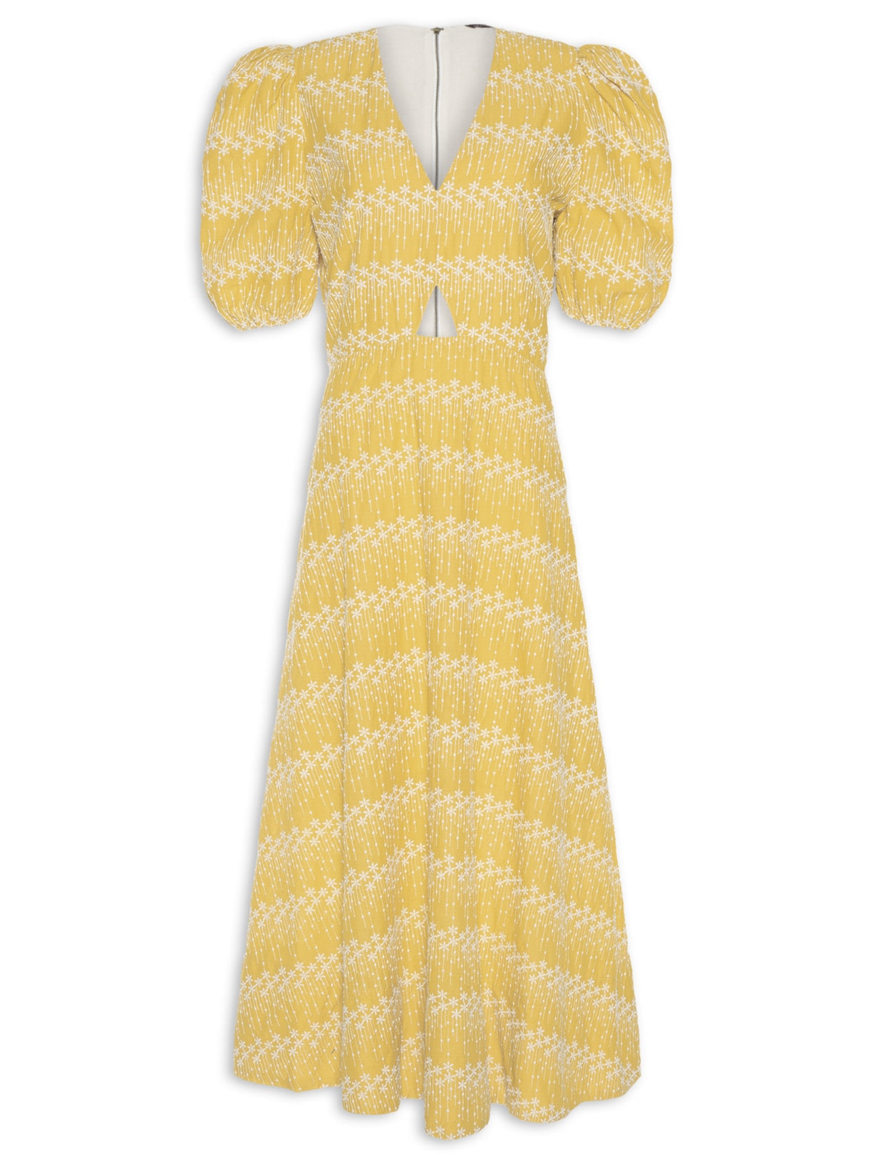 O vestido amarelo é confeccionado em laise. A peça possui decote V, mangas curtas bufantes com elástico embutido nos punhos, recorte vazado na parte frontal, forro, comprimento midi, caimento reto, shape solto, acabamento pespontado e fehamento posterior por zíper metálico.