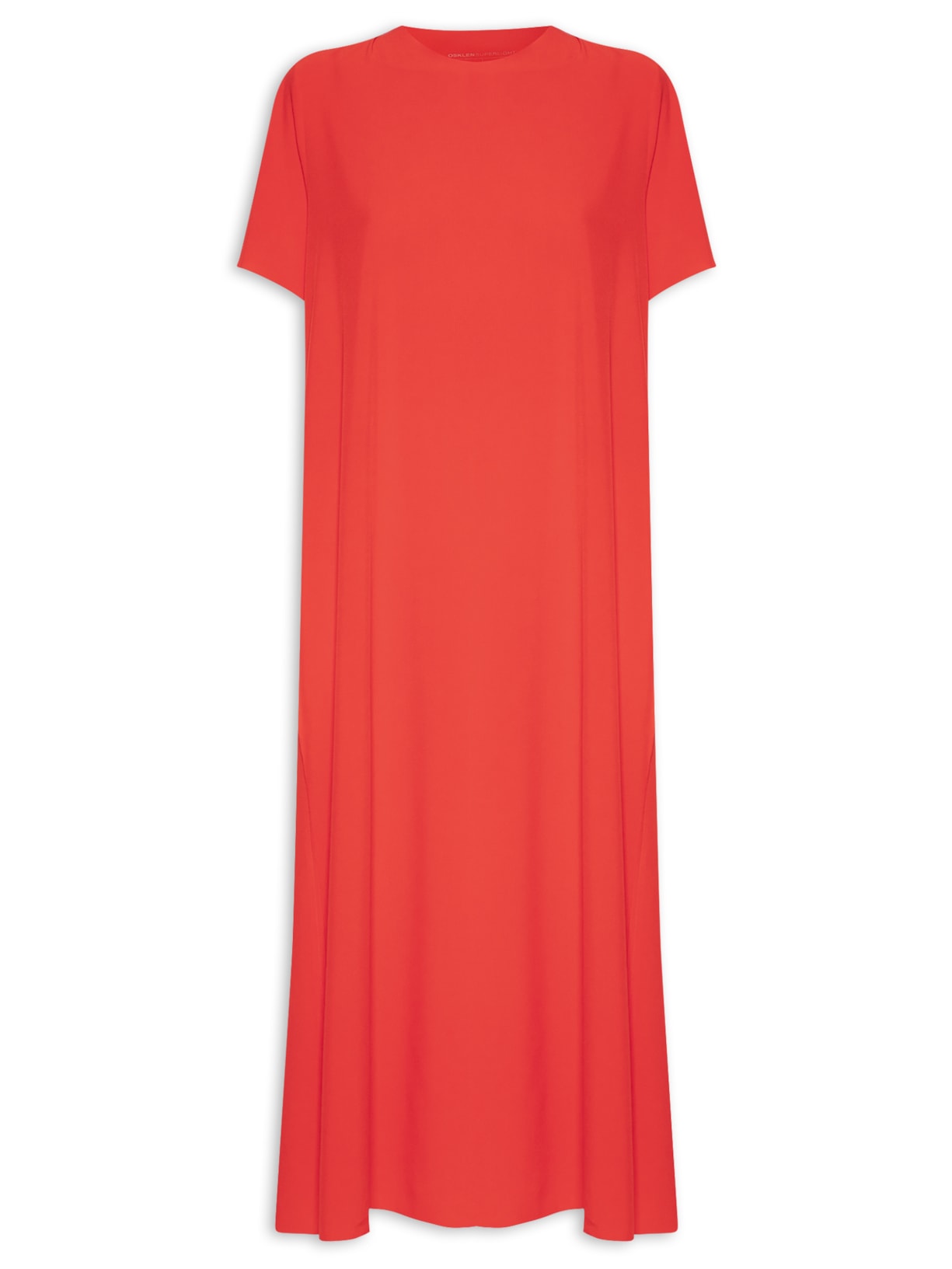 O vestido vermelho é confeccionado por tecido leve com alta elasticidade. A peça solta ao corpo possui decote redondo, mangas curta e comprimento longo.