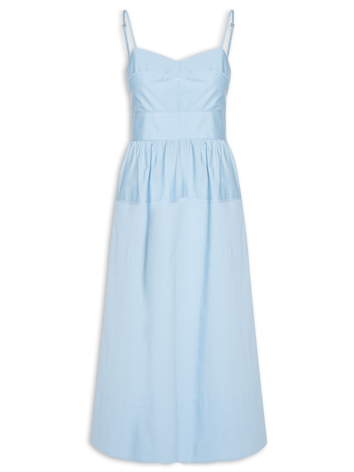 O vestido azul é confeccionado por tecido leve sem elasticidade. A peça solta ao corpo possui decote v, alças finas ajustáveis, cavas estendidas, bolsos frontais no modelo faca, recortes frontais e posteriores, forro, fechamento posterior por zíper e comprimento midi.